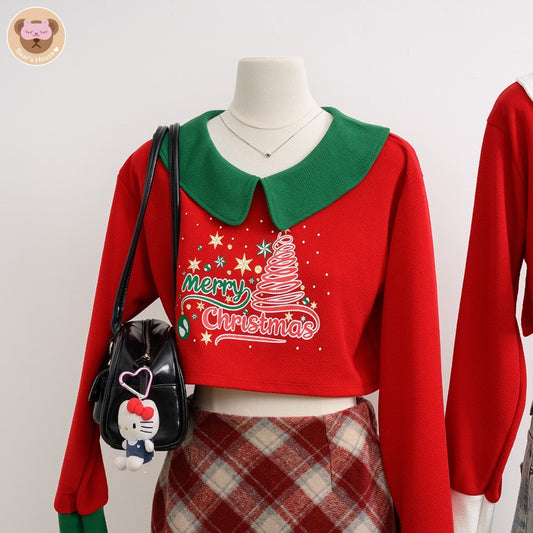 Merry Christmas Crop เสื้อครอปเเขนยาว คอบัว สกรีนลาย ผ้าวูลเวฟ ***ไม่รวมกระโปรง***