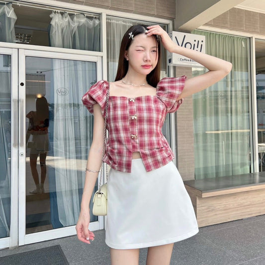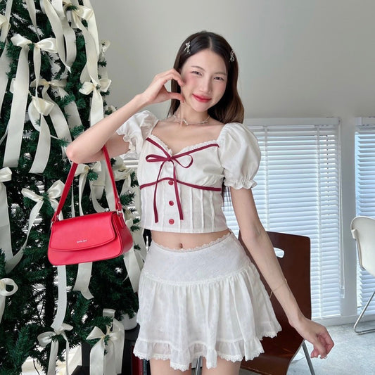Nita Crop เสื้อแขนตุ๊กตา ตีเกร็ดหน้าแต่งกระดุม ตัดขอบแต่งลูกไม้