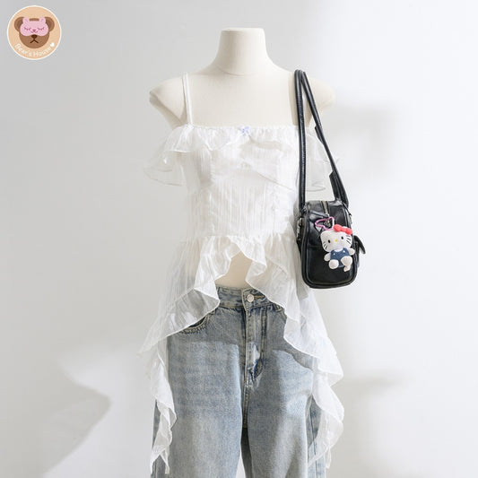 Shawty Top เสื้อเเขนระบาย 2 ชั้น เเต่งโบว์ด้านหน้า