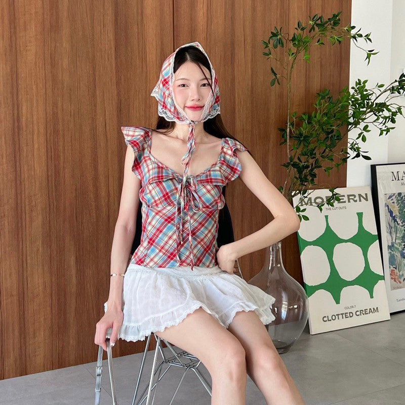 พรีส่งพุธ ที่ 18 Garry Crop เสื้อสายเดี่ยวเเขนระบาย ลายสก็อตสไตล์เกาหลี
