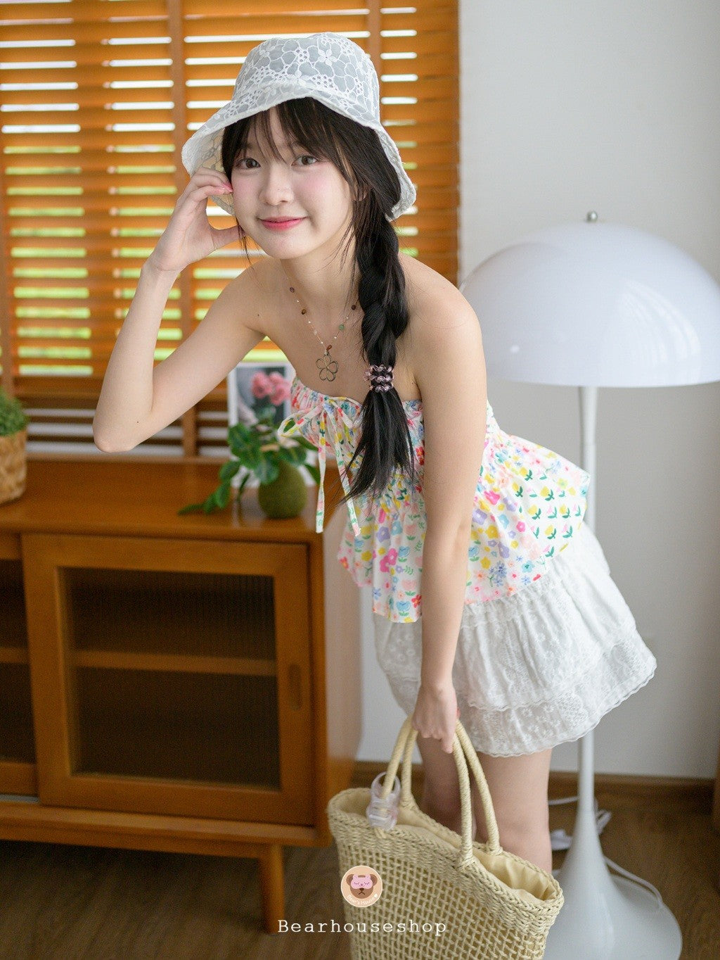 Be a flower girl in the Comin Floral Top! With a strapless smock and a beautiful floral pattern, this top is versatile with two ways to wear it - either with a bow tie or around the neck. Plus, the cute end adds a charming touch. Get ready to bloom in this top!