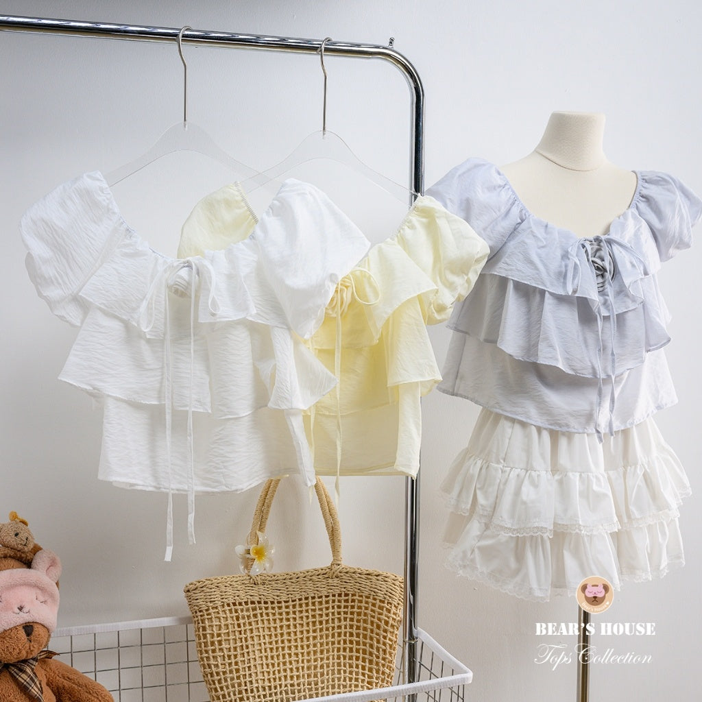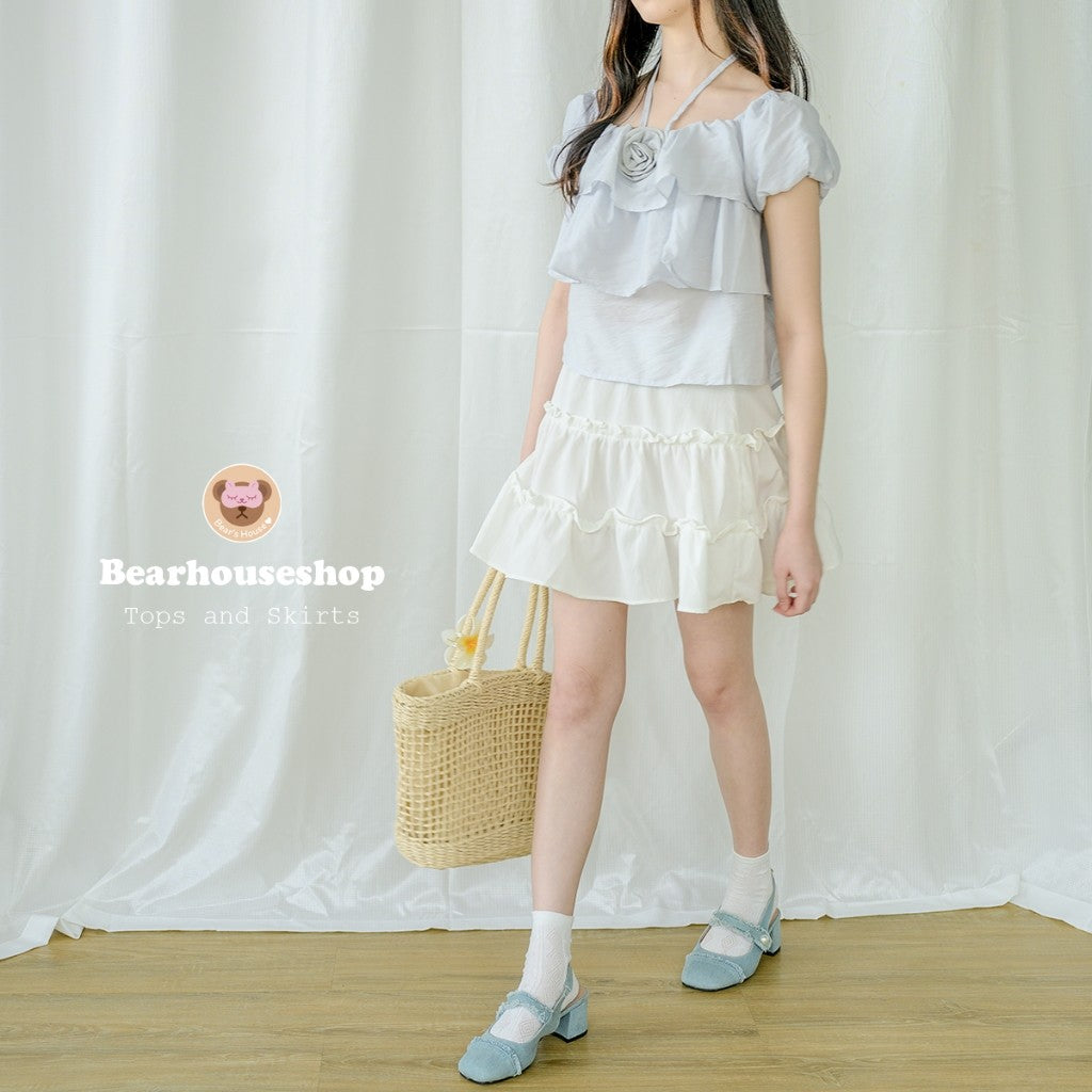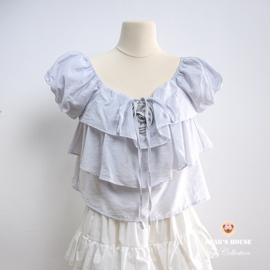 Introducing the Erika Layers Crop - the off-the-shoulder shirt with ruffled layers, flower decorations, and a necktie. Versatile, wear it as off-shoulder or normal, for that cute feeling or fun travel content.