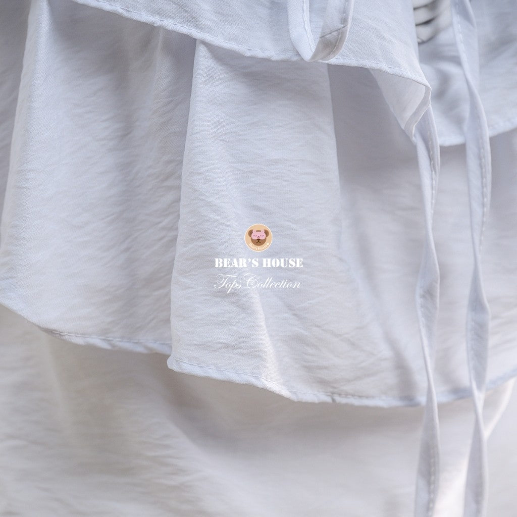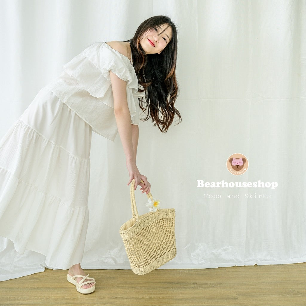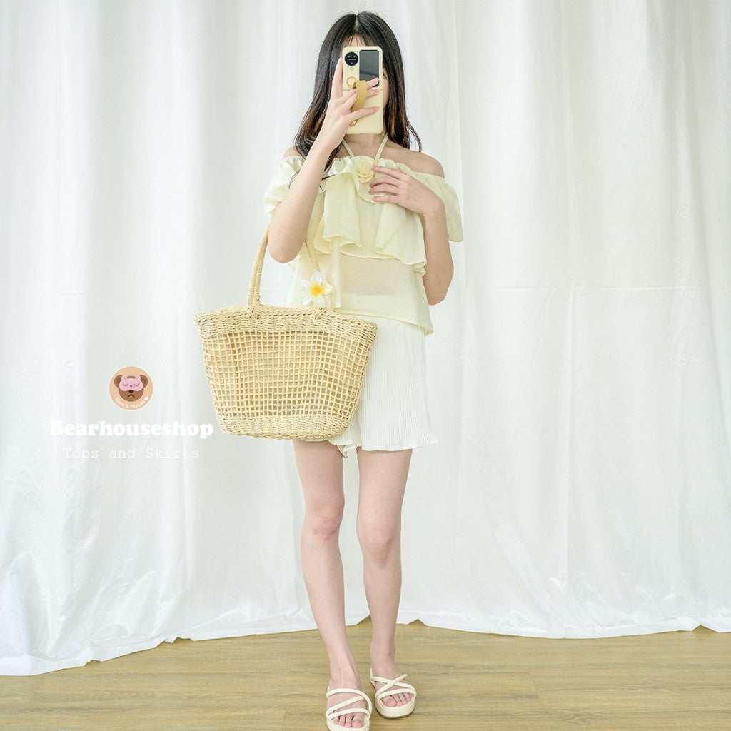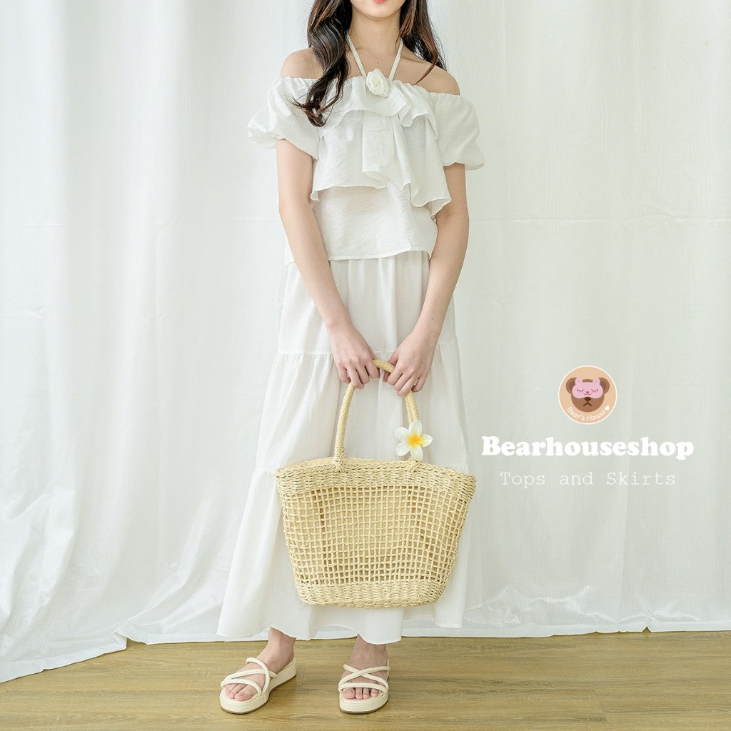 Introducing the Erika Layers Crop - the off-the-shoulder shirt with ruffled layers, flower decorations, and a necktie. Versatile, wear it as off-shoulder or normal, for that cute feeling or fun travel content.