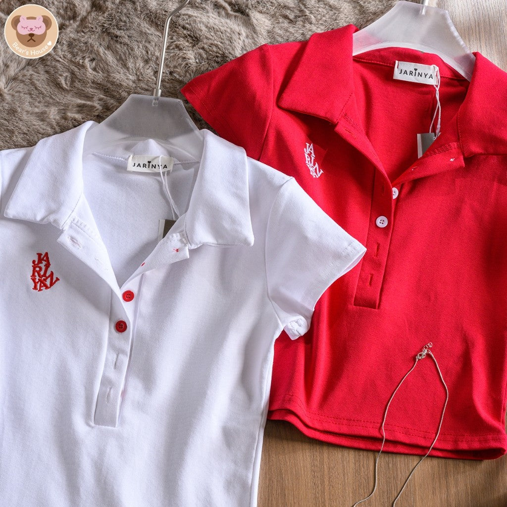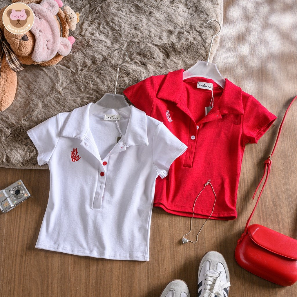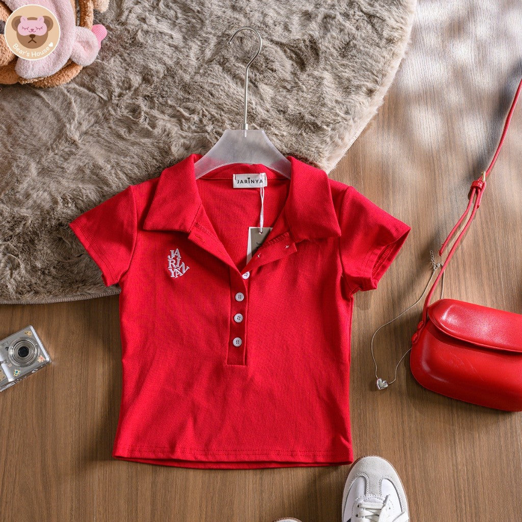 Ganni Shirt เสื้อเเขนสั้น ปักตัวอักษร เเต่งกระดุมหน้า เเกะใช้งานได้จริง