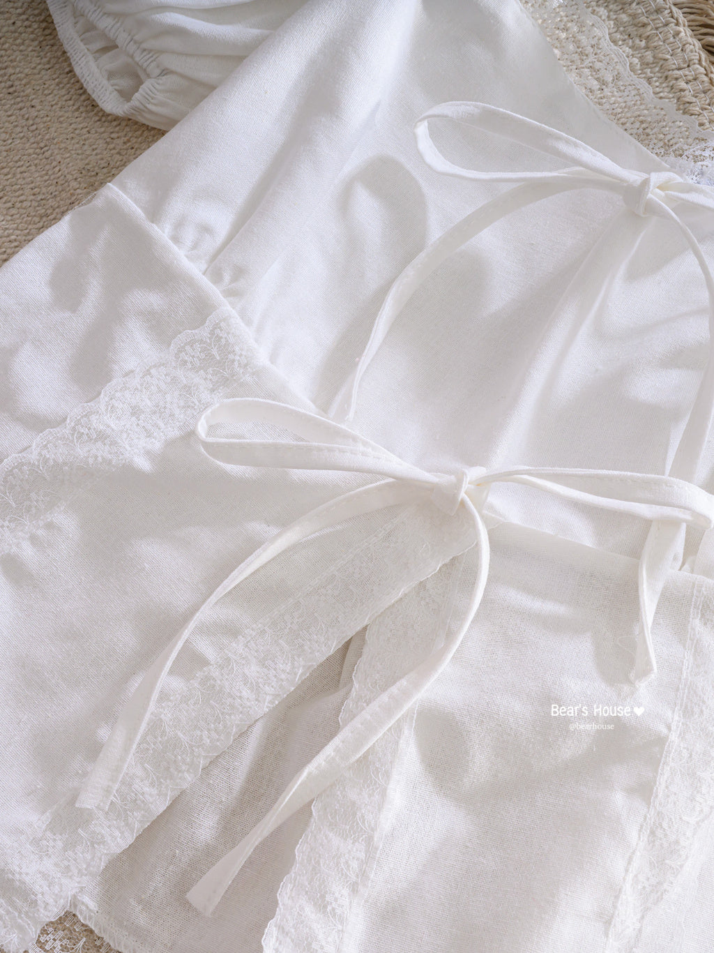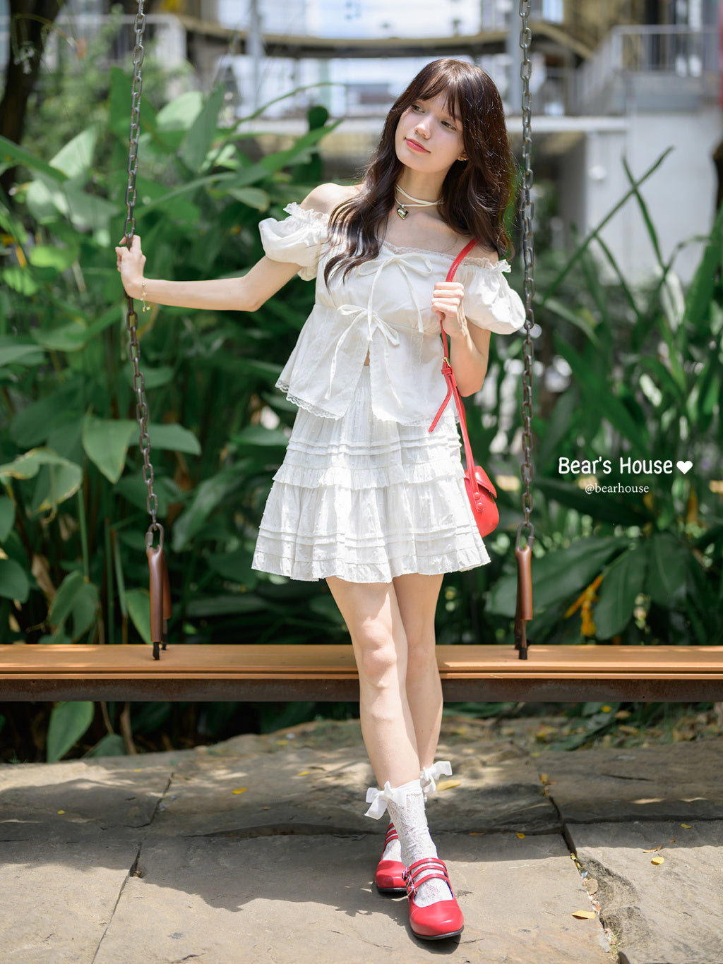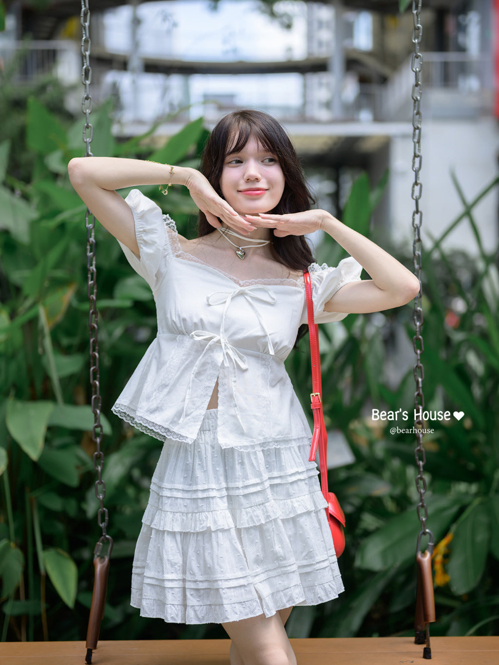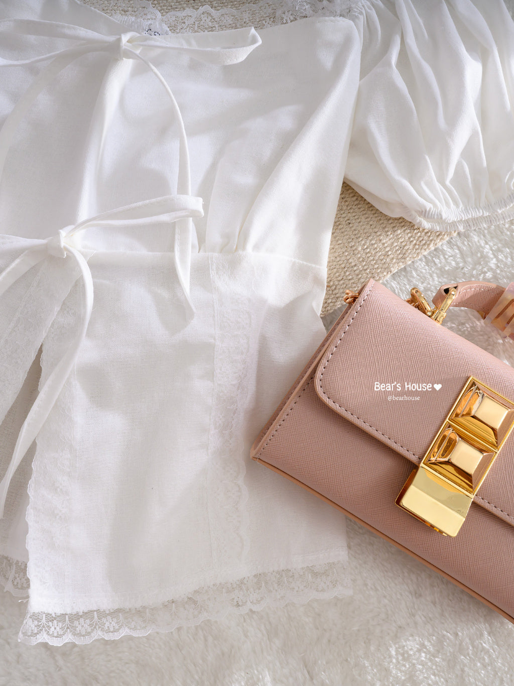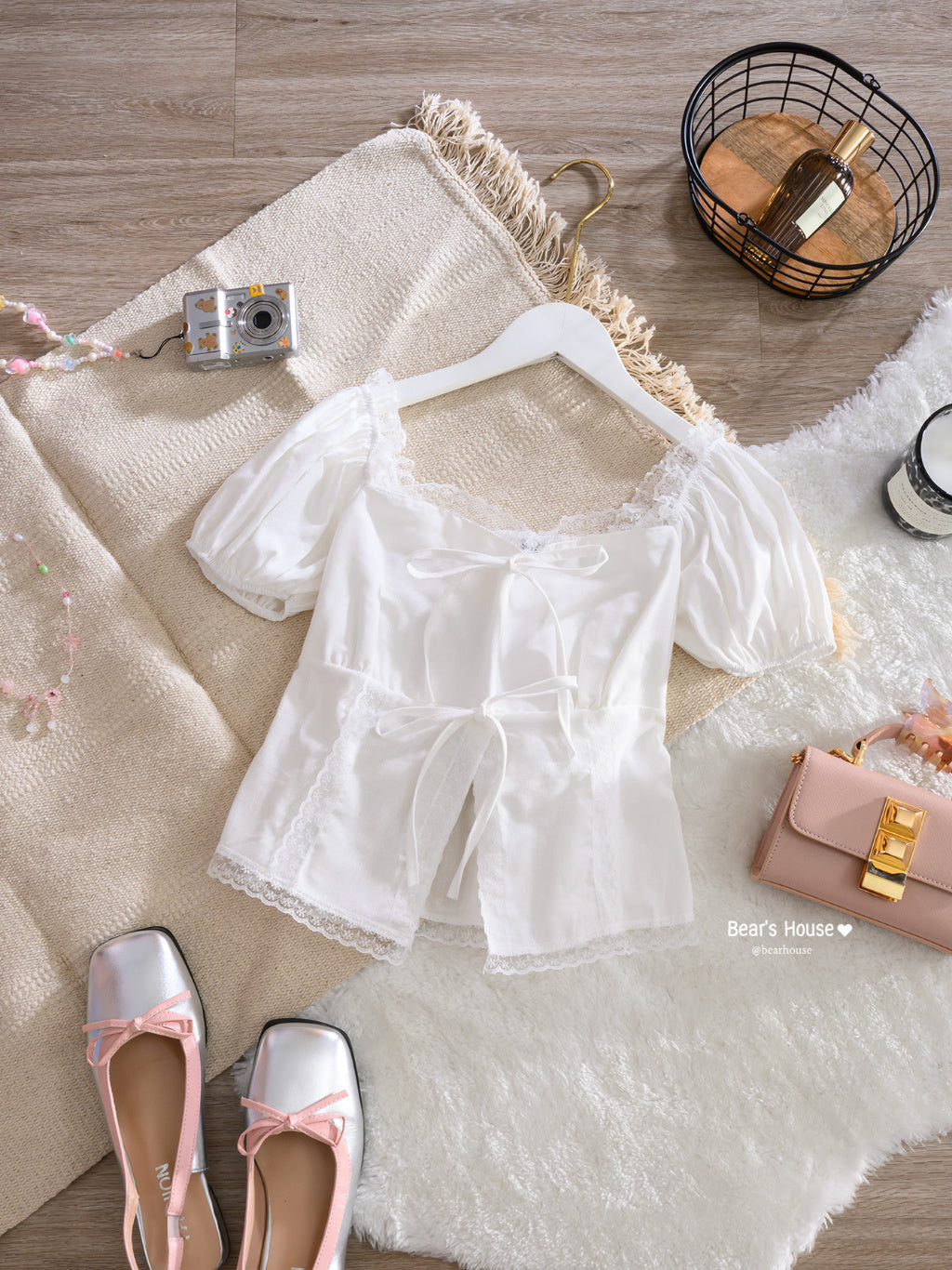 This Glaze Crop Shirt is perfect for your little doll! Featuring a cute lace decoration and a front bow tie detail, this top also has a front slit that allows you to wear it in two different ways - arms down or up. Plus, the back has an elastic band for a comfortable fit. You can style it with pants or skirts, and trust us, your little sister will look adorable in it! ❤️❤️