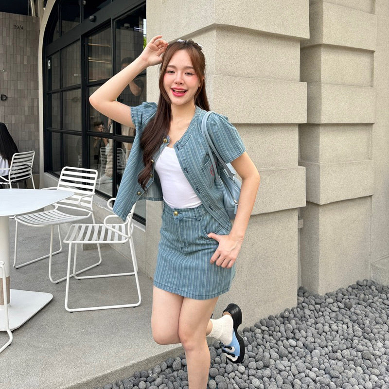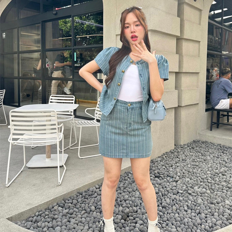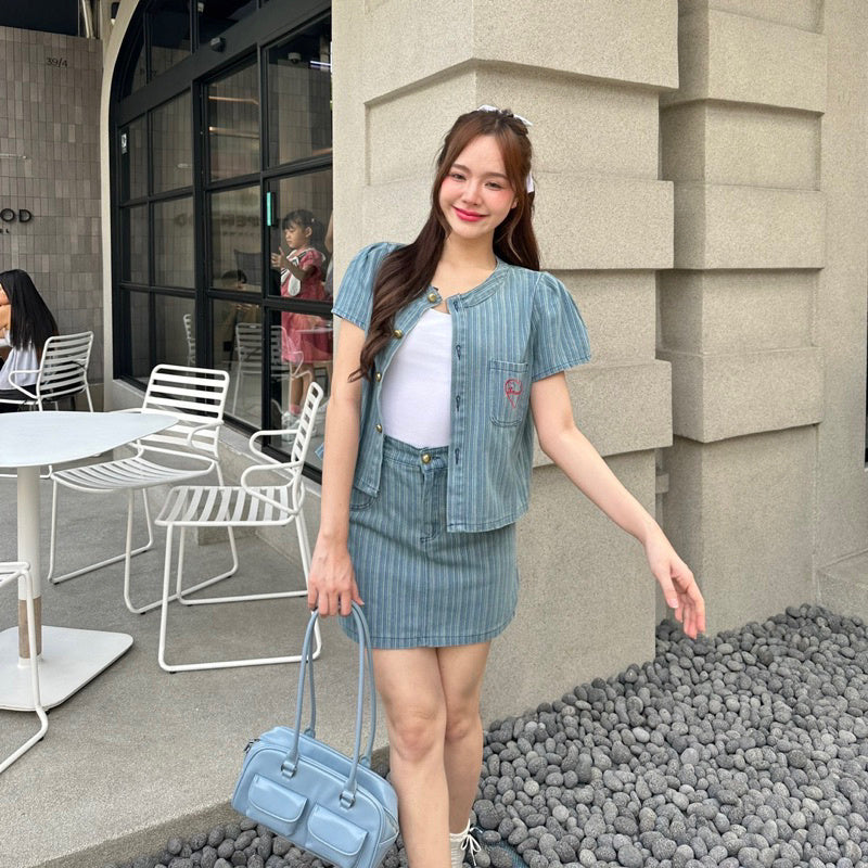 Get ready to turn heads with our Jean Set - a perfect 2 piece outfit featuring a doll sleeve t-shirt and short skirt. The high waist and heart-embroidered pockets add a touch of cuteness to this set. Made with good quality stretchy fabric, you'll be stylish and comfortable all day long.