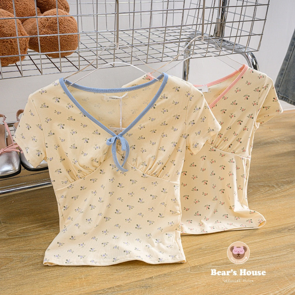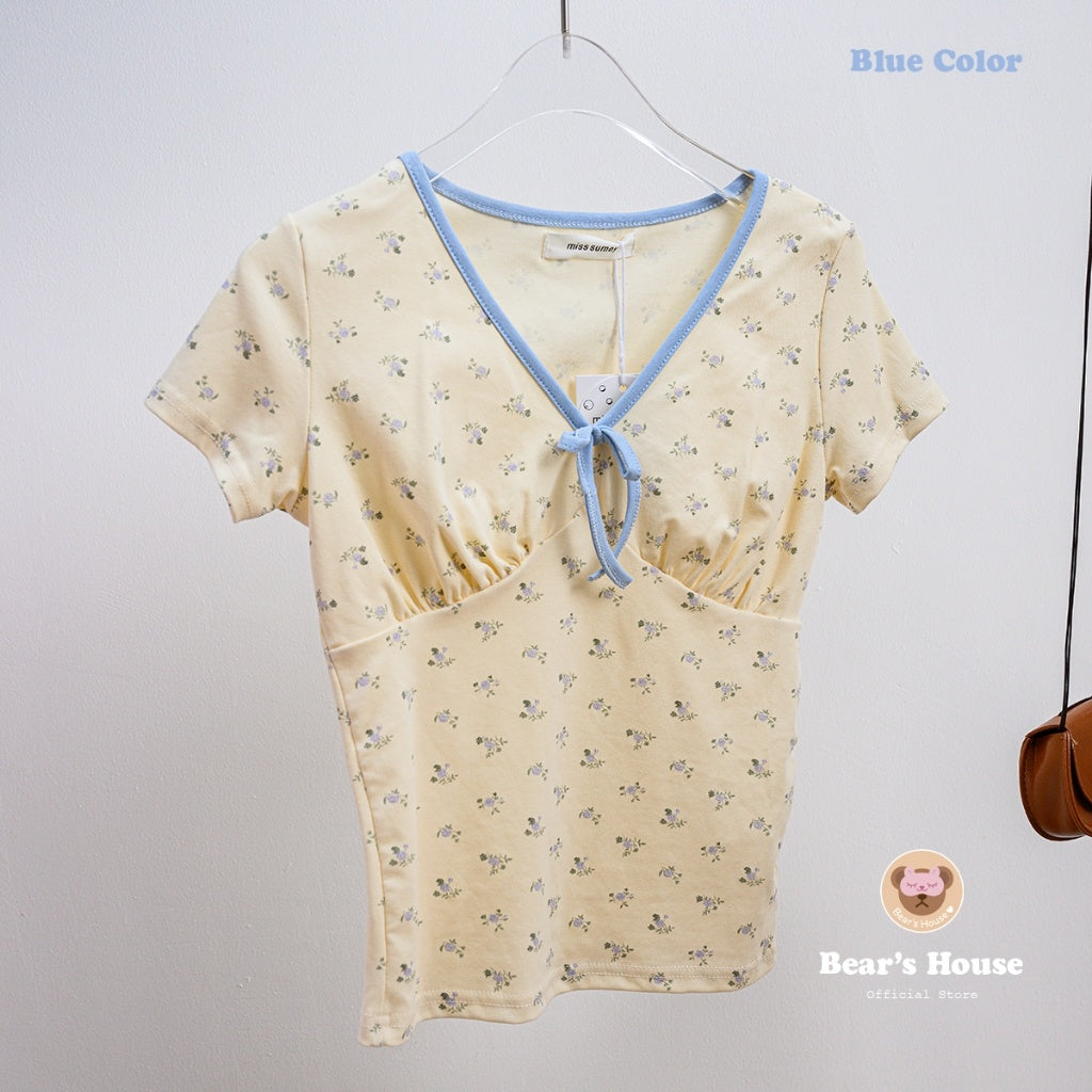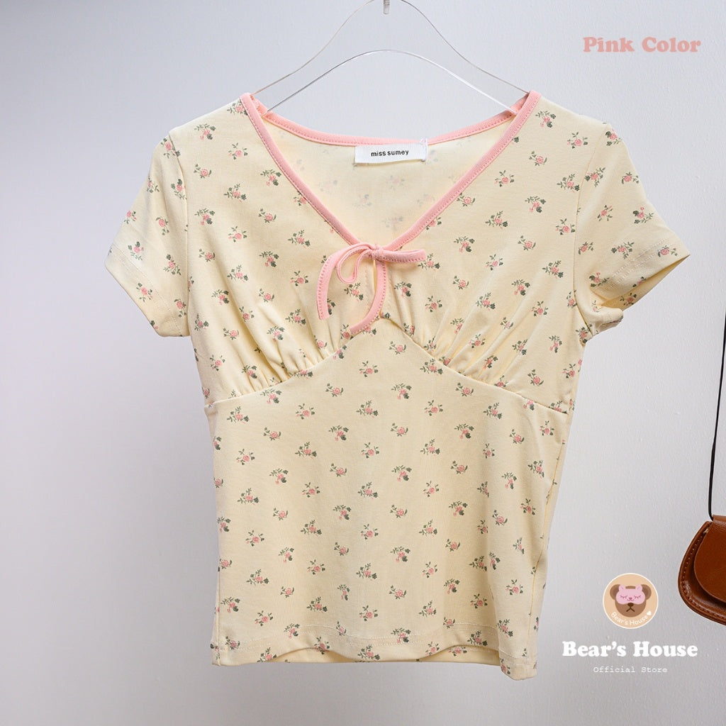Kome Floral V-neck shirt with a floral pattern and a playful pleat and bow. Made with soft, stretchy fabric, it's both cute and comfortable. Perfectly pairs with skirts or pants for a trendy look.❤️