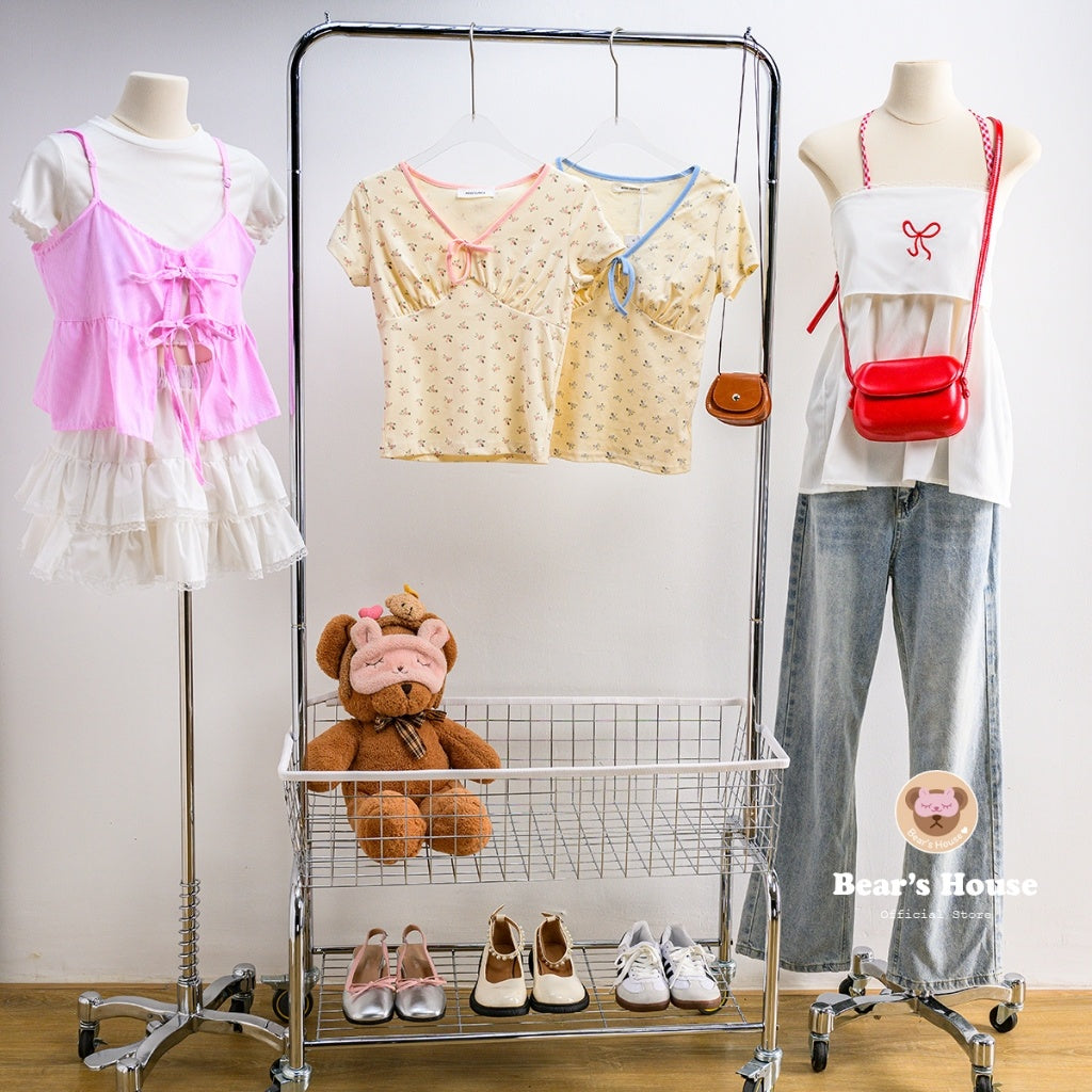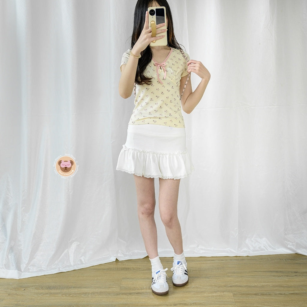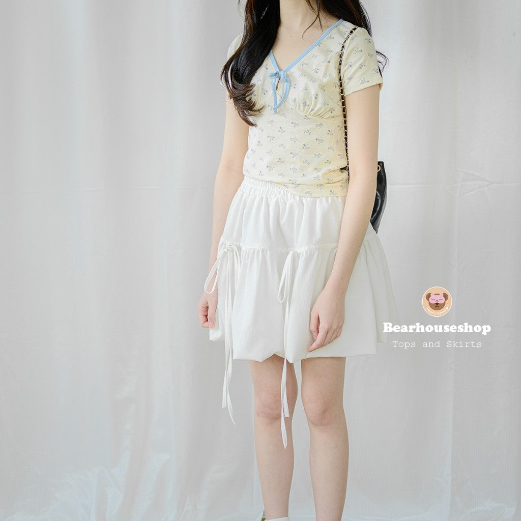 Kome Floral V-neck shirt with a floral pattern and a playful pleat and bow. Made with soft, stretchy fabric, it's both cute and comfortable. Perfectly pairs with skirts or pants for a trendy look.❤️