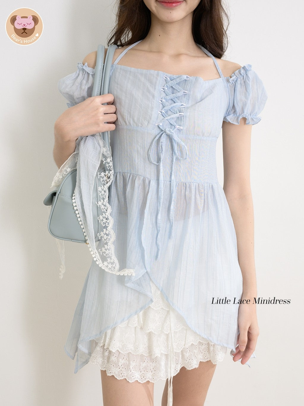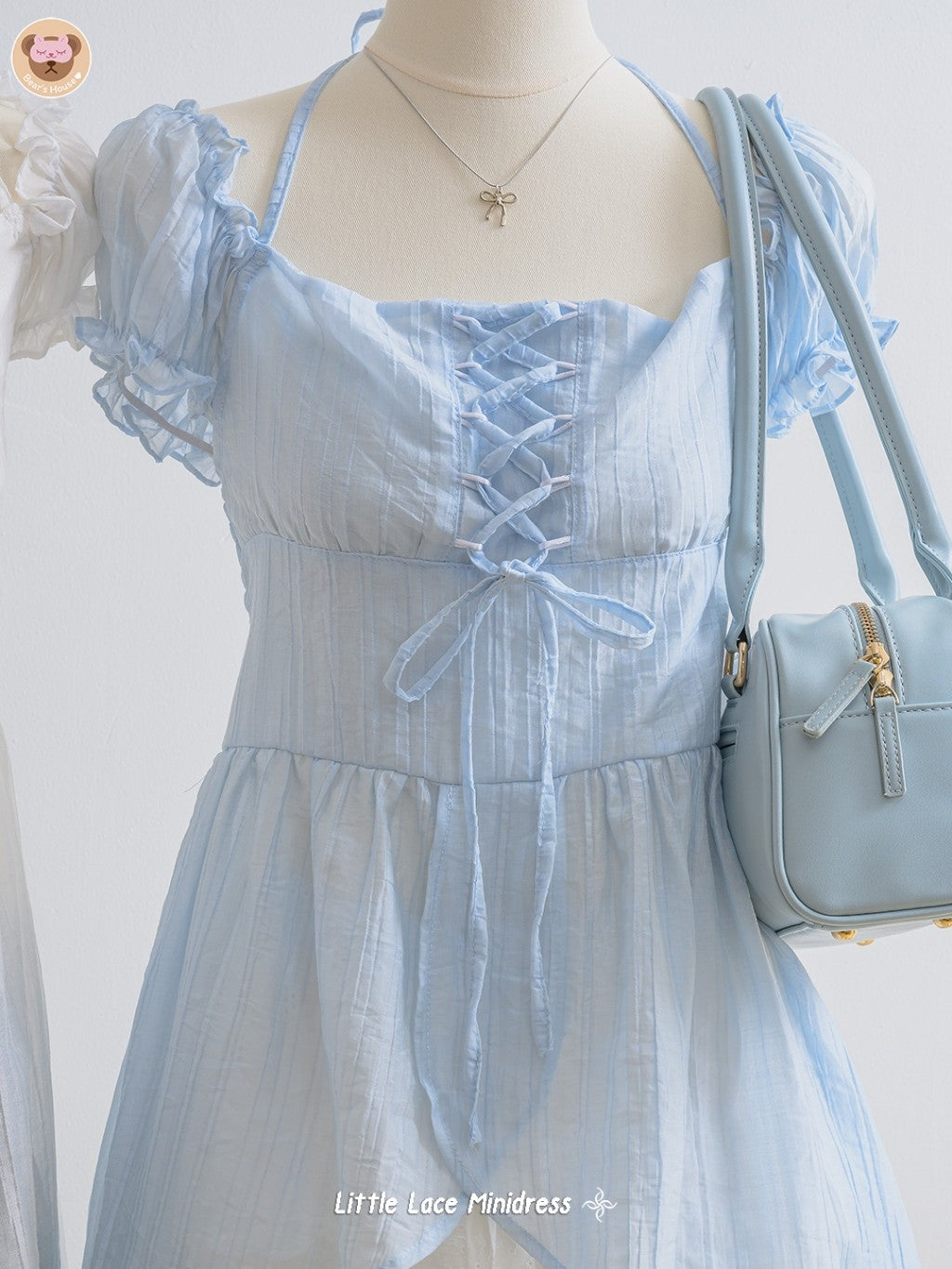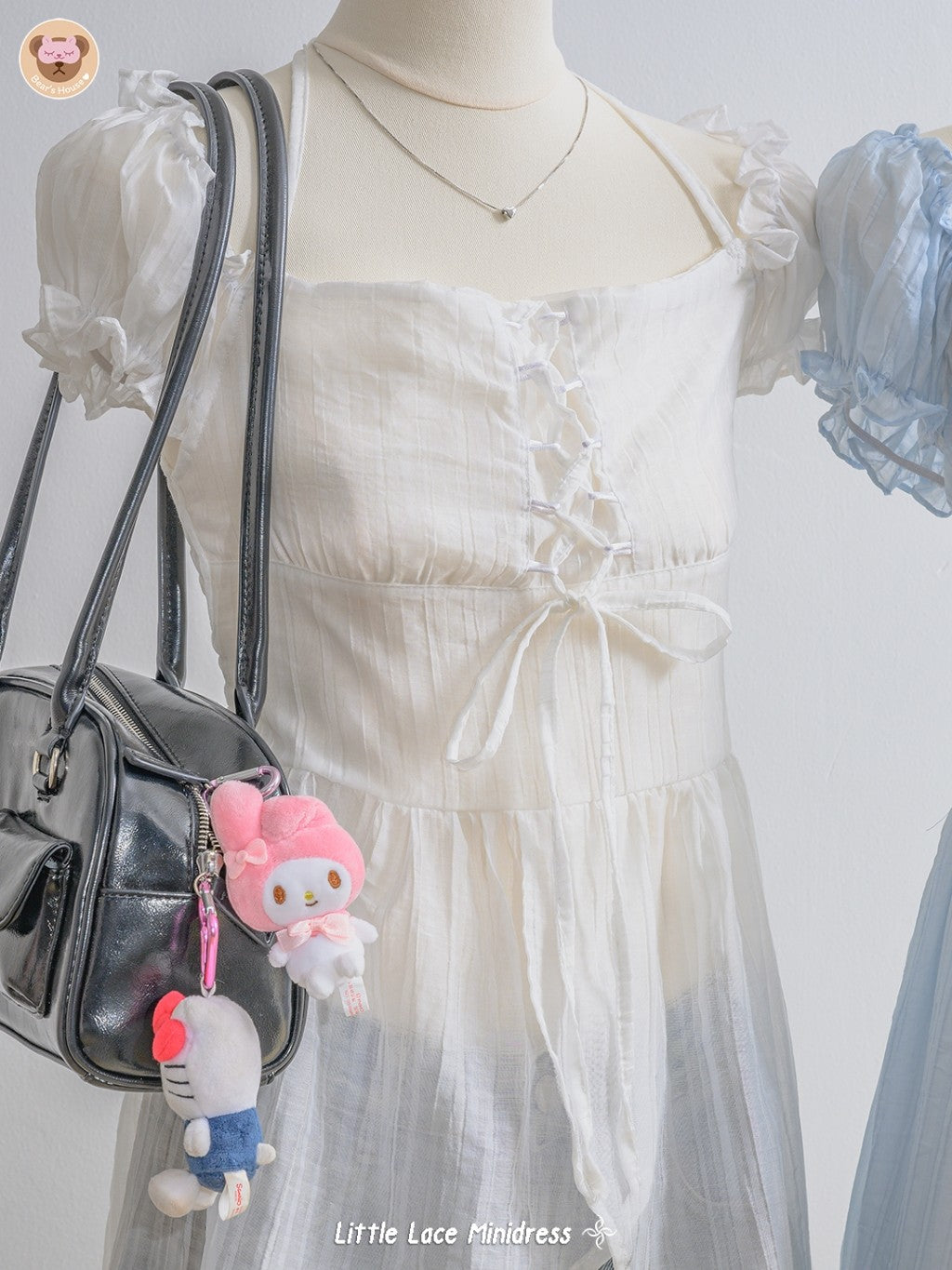 Little Lace Minidress มินิเดรสเเขนตุ๊กตา ตัวยาว ดีเทลมีเชือกผูกคอ ด้านหลังสม็อค