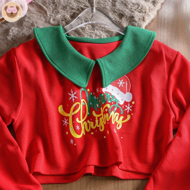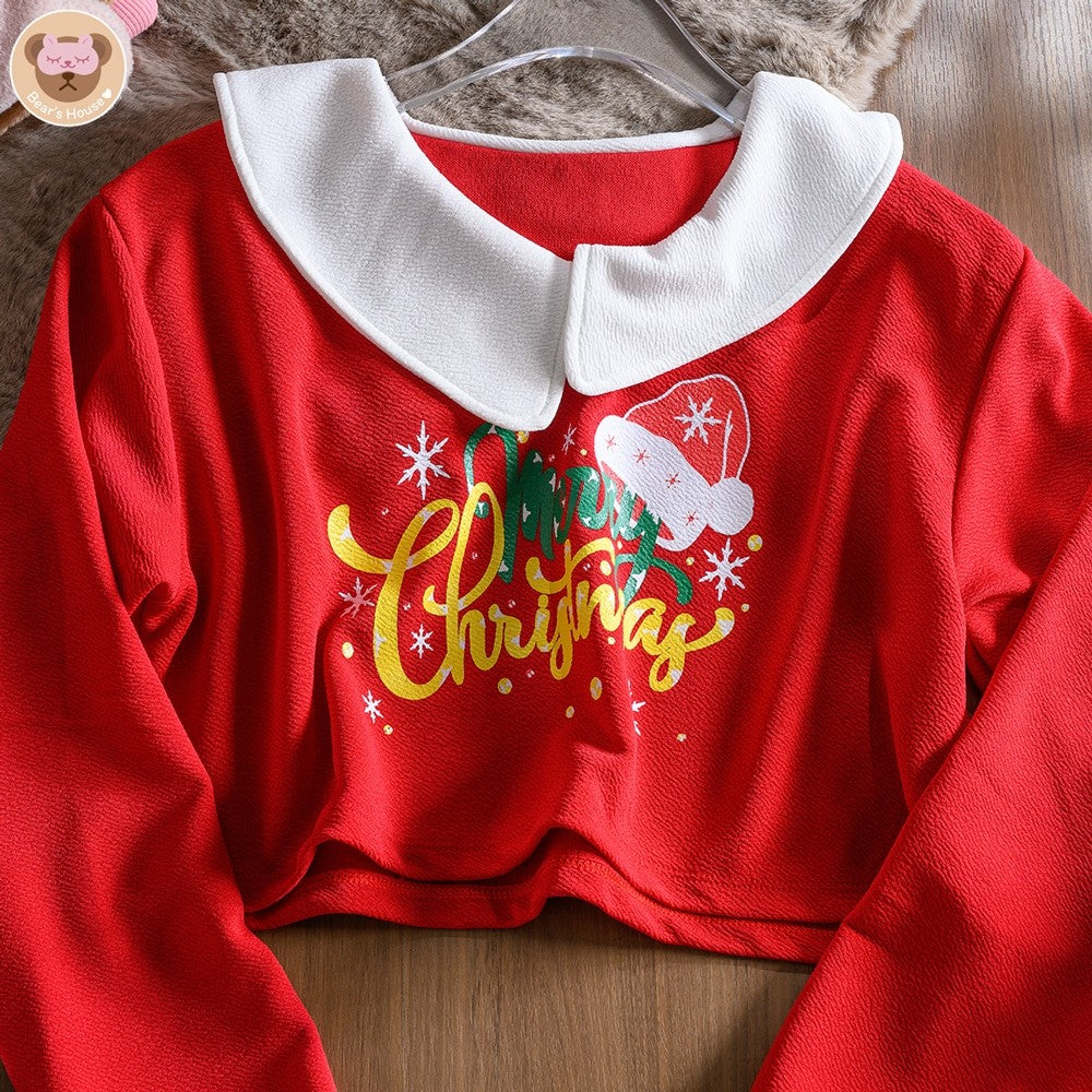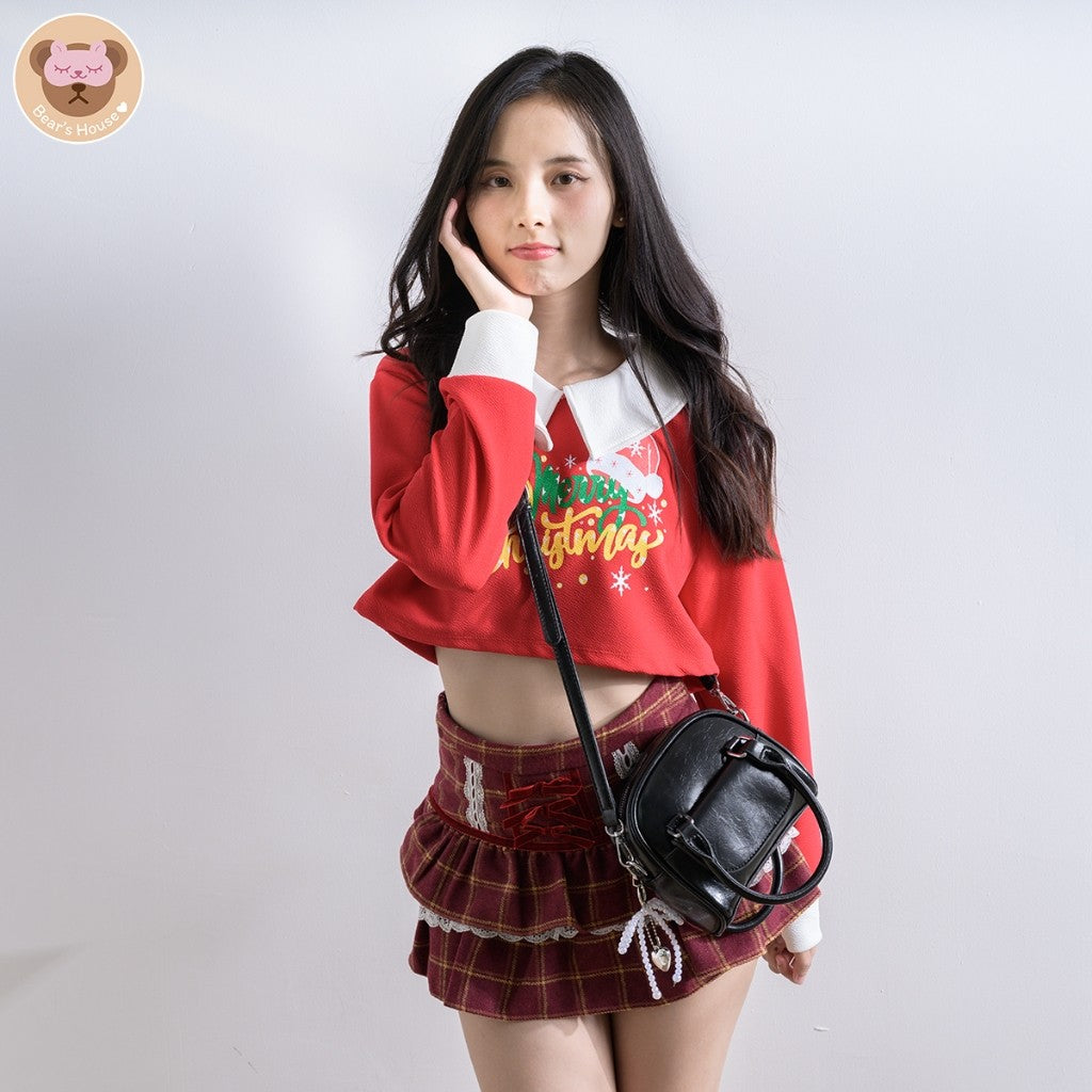Merry Christmas Crop เสื้อครอปเเขนยาว คอบัว สกรีนลาย ผ้าวูลเวฟ ***ไม่รวมกระโปรง***