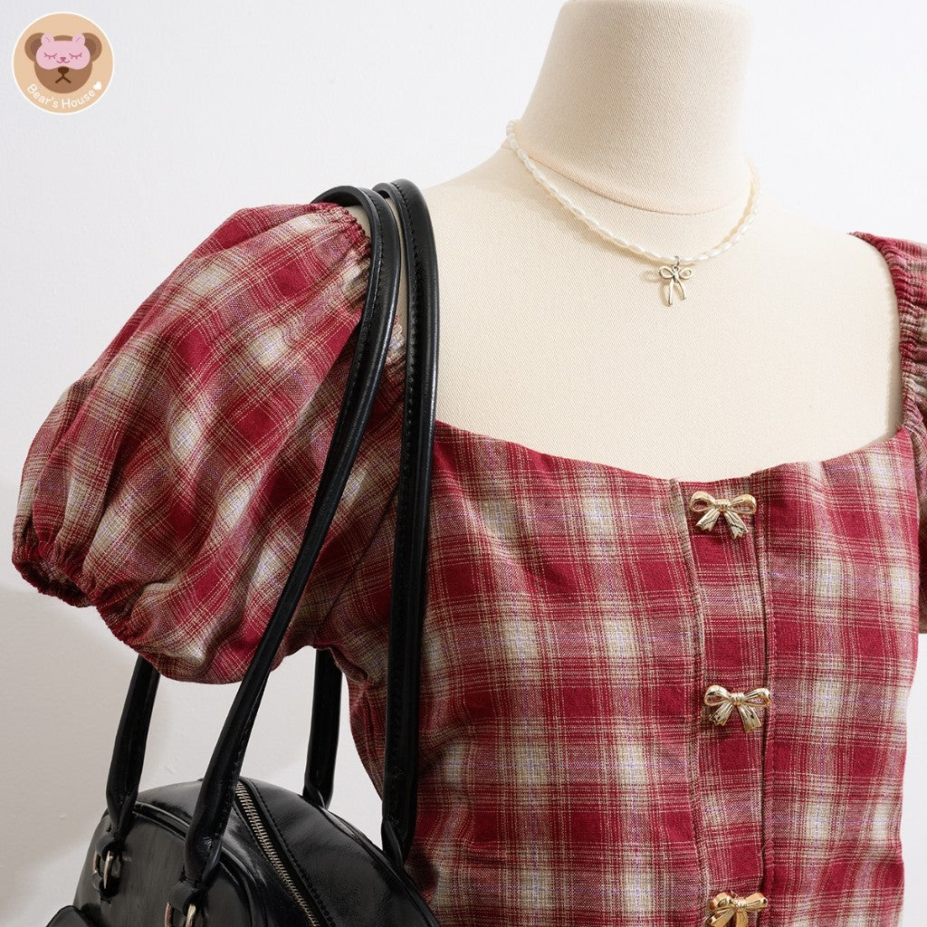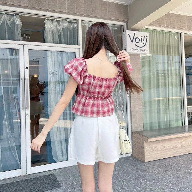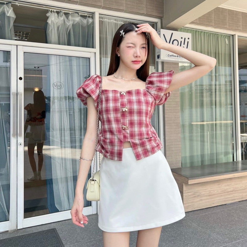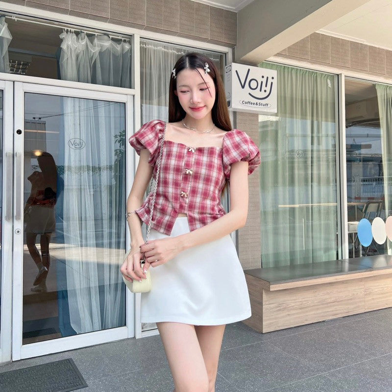 Mony Crop แขนตุ๊กตาแต่งอะไหล่โบว์สีทอง น่ารักมากๆ แต่งดีเทลเว้าตรงกลางเสื้อ จับจีบข้างๆตัวให้ดูมีอะไร หลังดึงยาง หน้าอกซับสองชั้น
