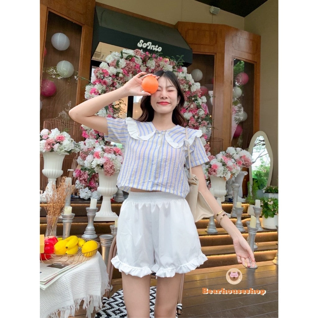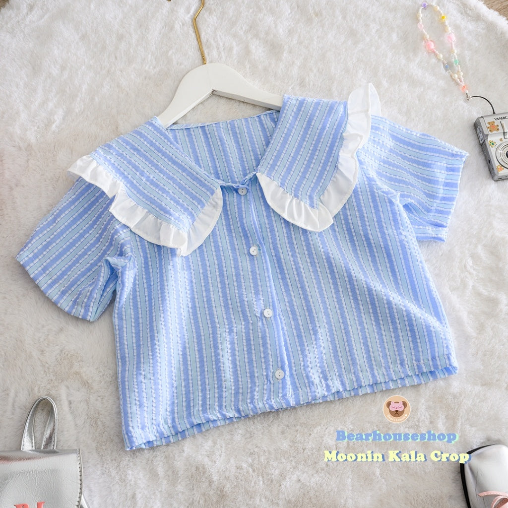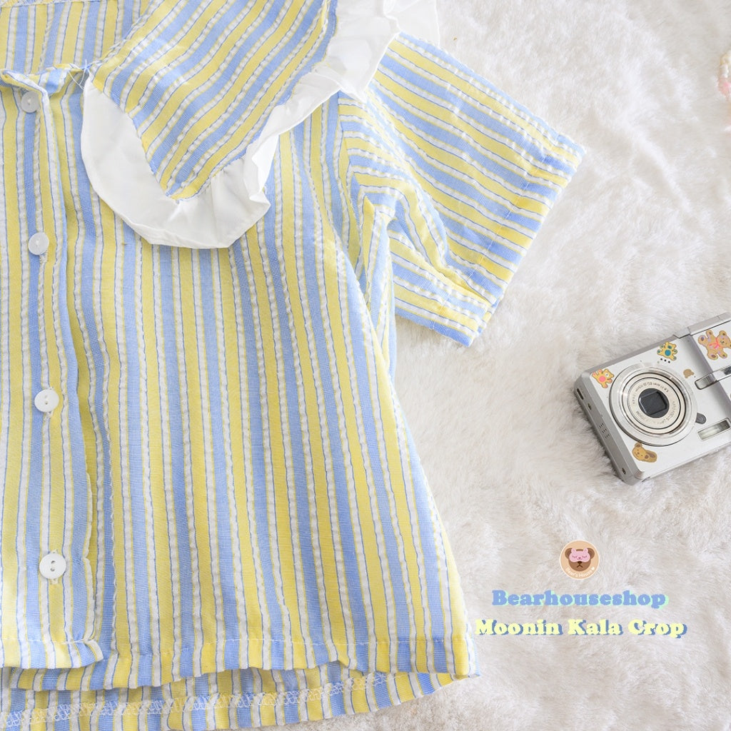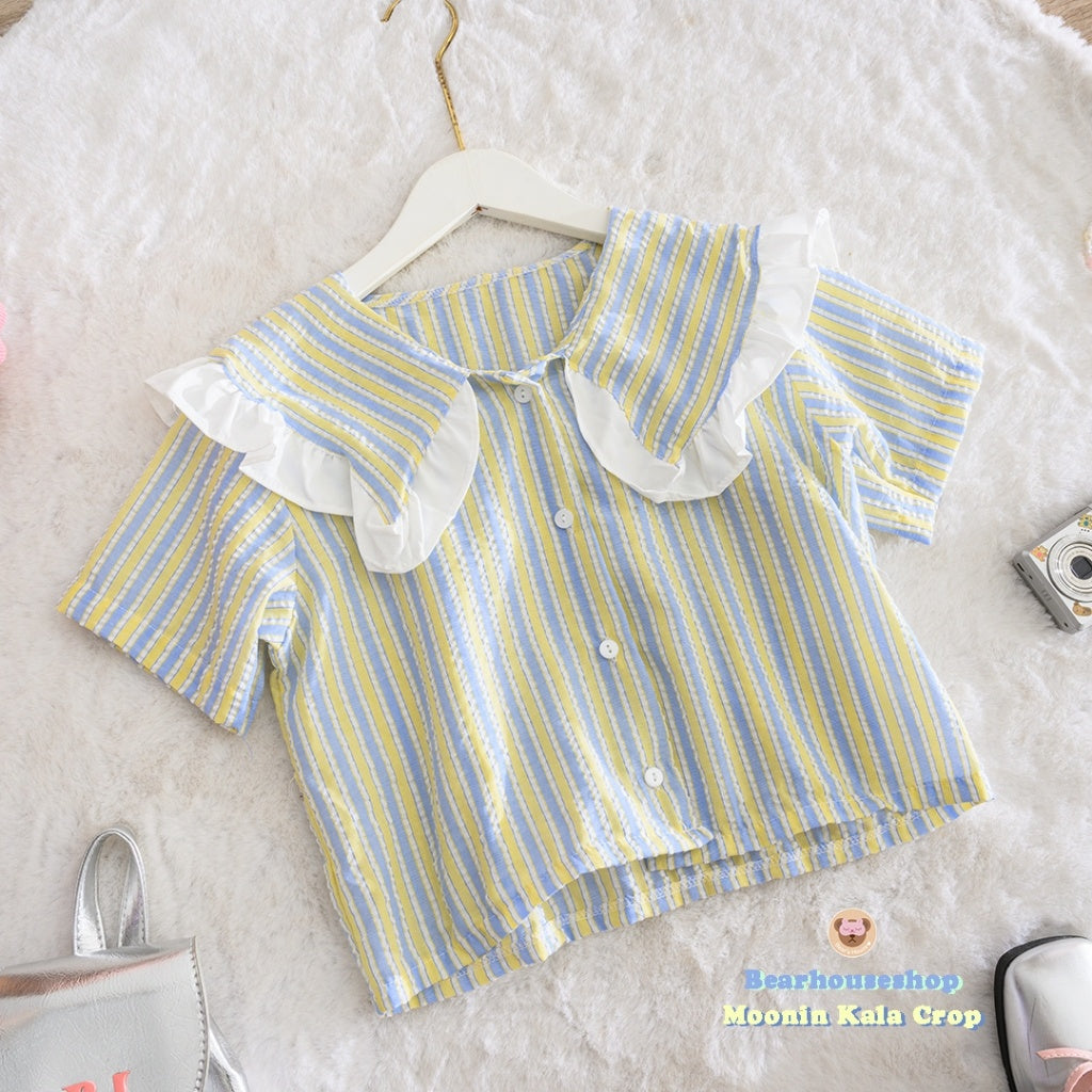 Make a statement with the Moonin Kala Crop. This bowler collar shirt is decorated with ruffles and striped fabric, adding a touch of playfulness to any outfit. The pastel colours and beautiful work make it both stylish and cute. Mix and match with any skirt or pants for a unique and fun look.