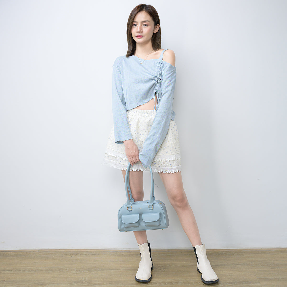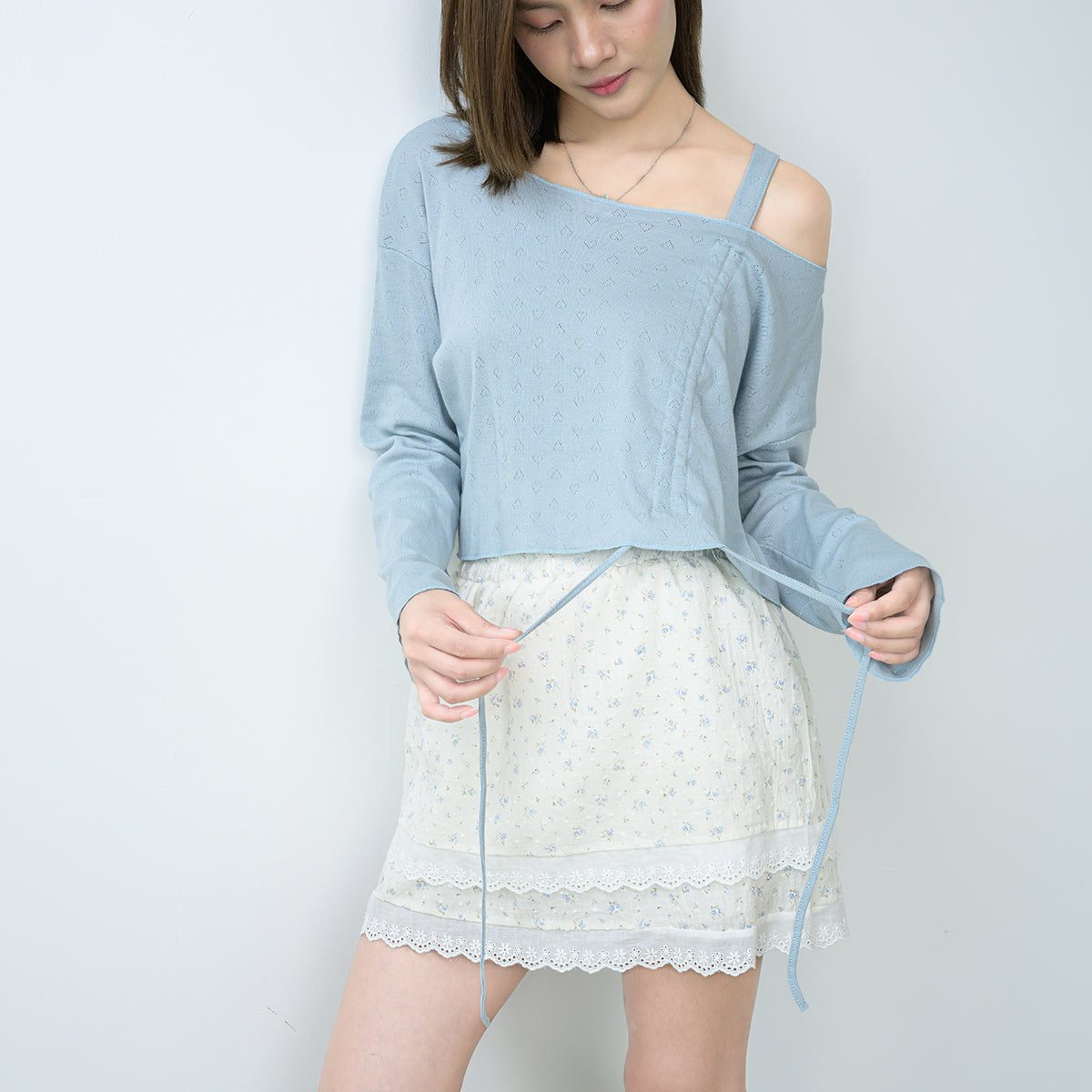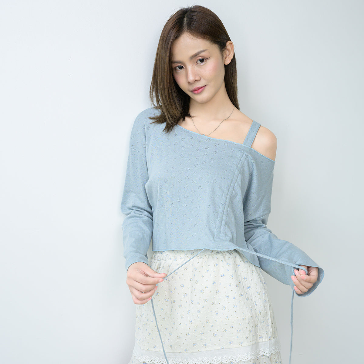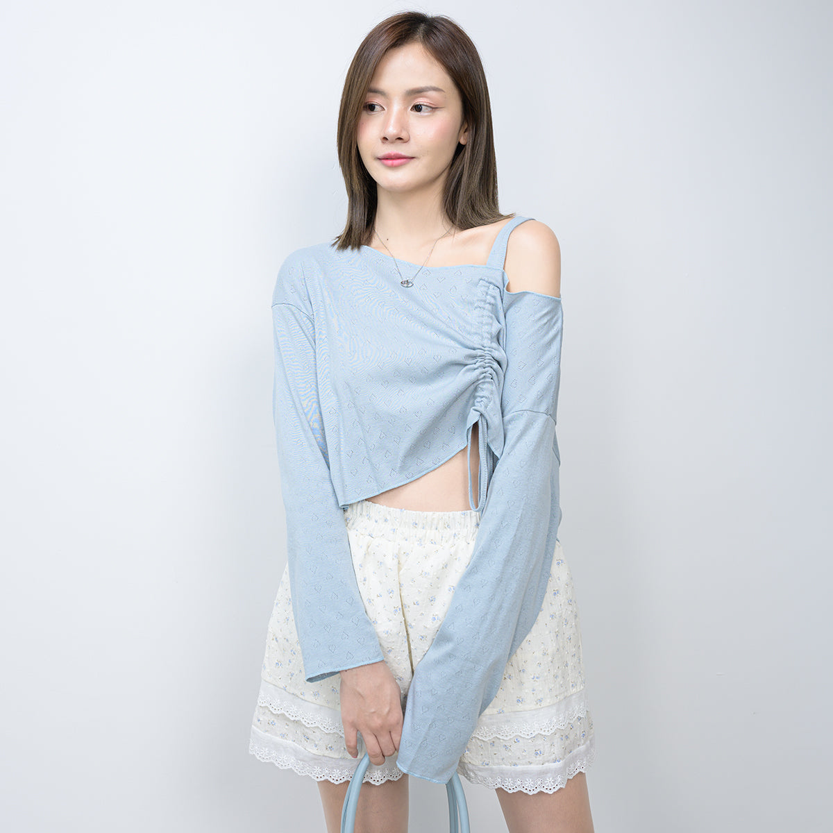 Introducing the Rami Crop - the perfect combination of comfort and style. Made with soft perforated ribbed fabric, this off-shoulder long-sleeve shirt features a front tie detail that can be adjusted to your liking. Pair it with a skirt or pants for a super cute look. It's a must-have for any wardrobe! ❤️