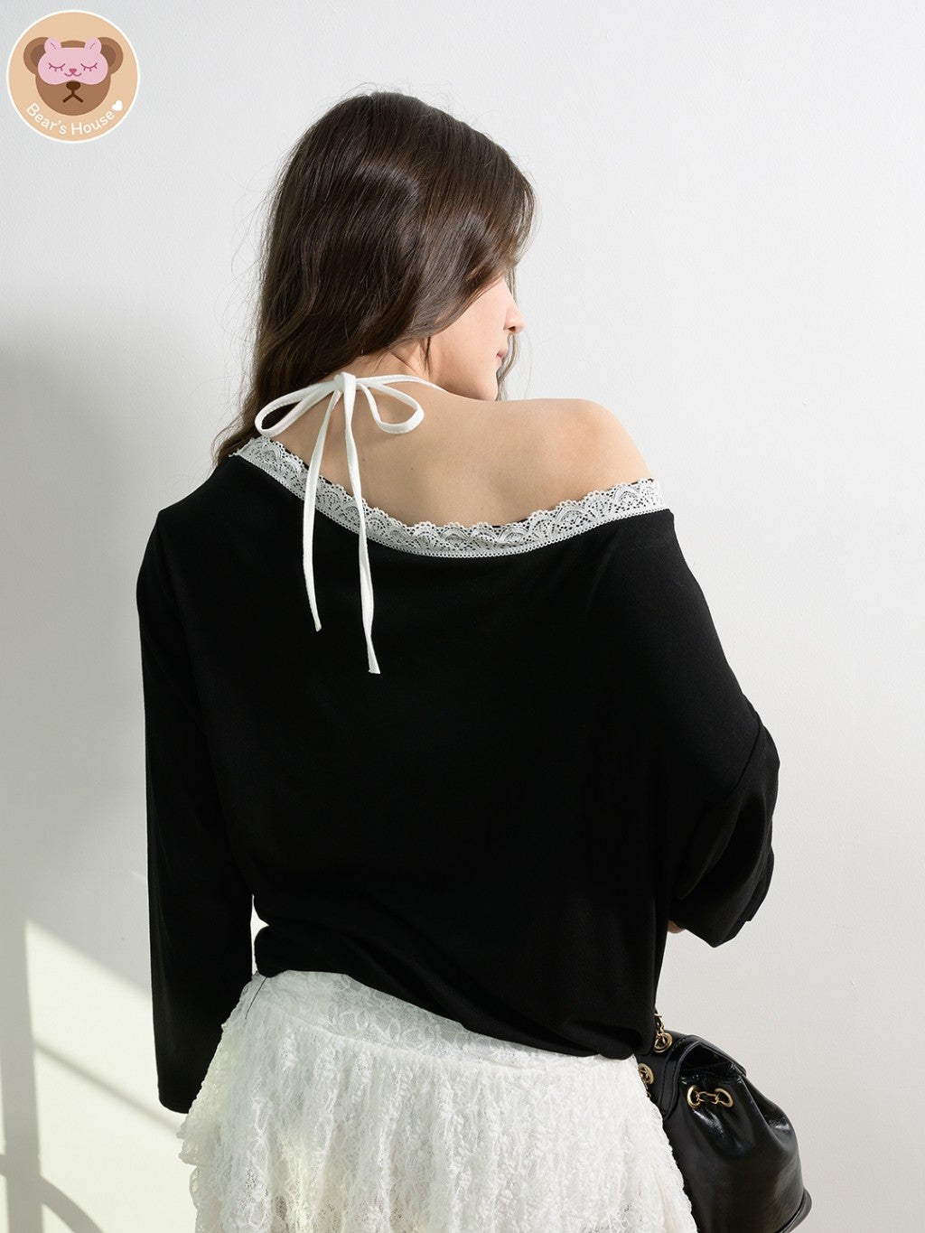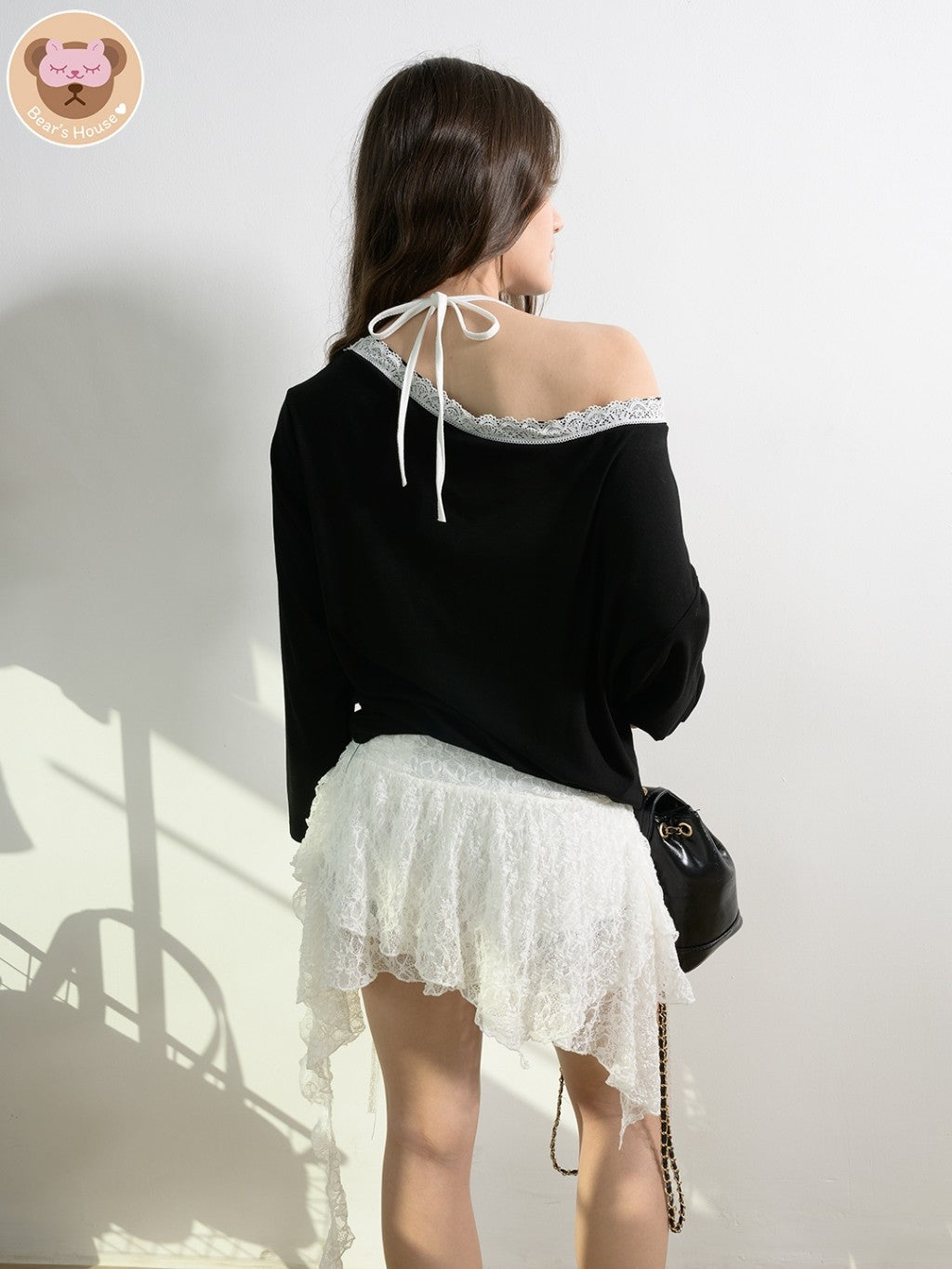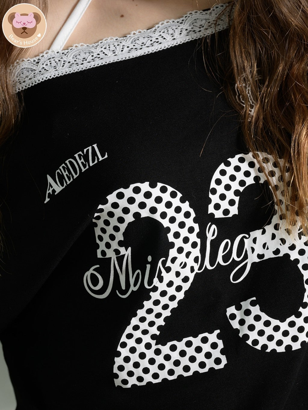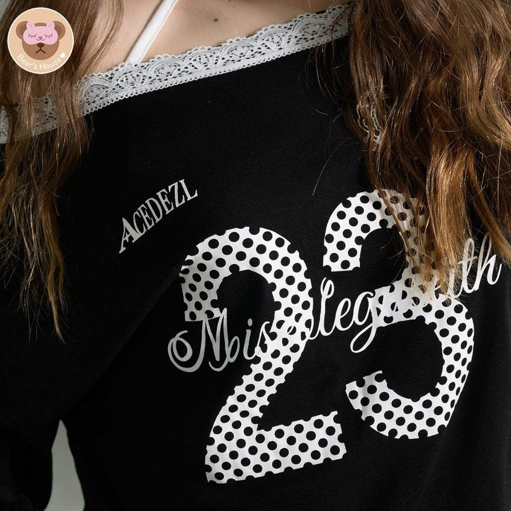 Typo Sunset เสื้อเเขนยาวเว้าไหล่ ผูกคอ ทรงโอเวอร์ไซส์ สกรีนตัวเลข 23 สไตล์สาวเกาหลี