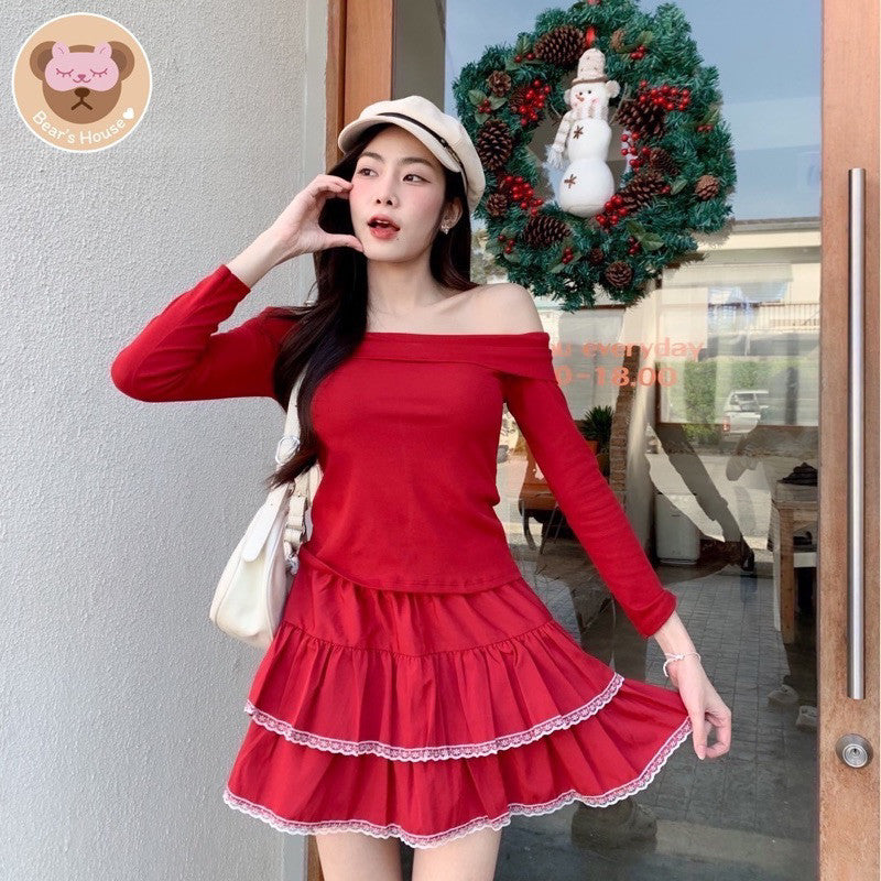 Waleb Top เสื้อทรงปาดไหล่ แขนยาว ผ้ายูนิ ***ไม่รวมกระโปรง***