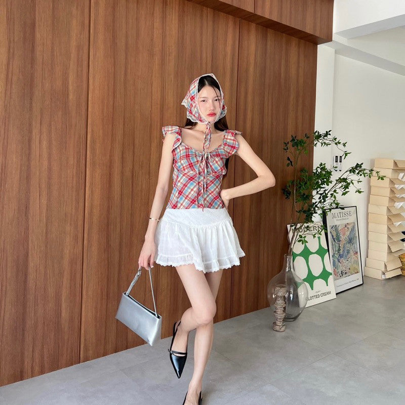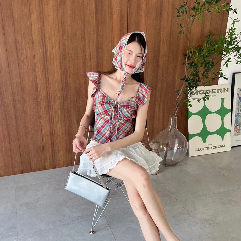 พรีส่งพุธ ที่ 18 Garry Crop เสื้อสายเดี่ยวเเขนระบาย ลายสก็อตสไตล์เกาหลี