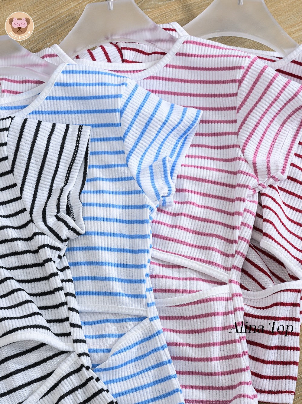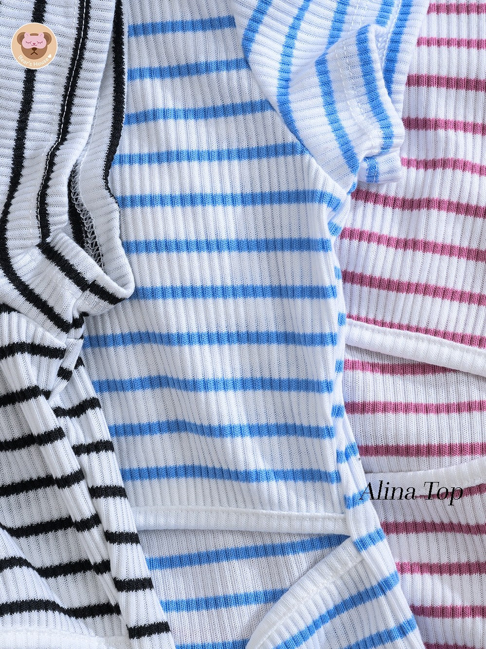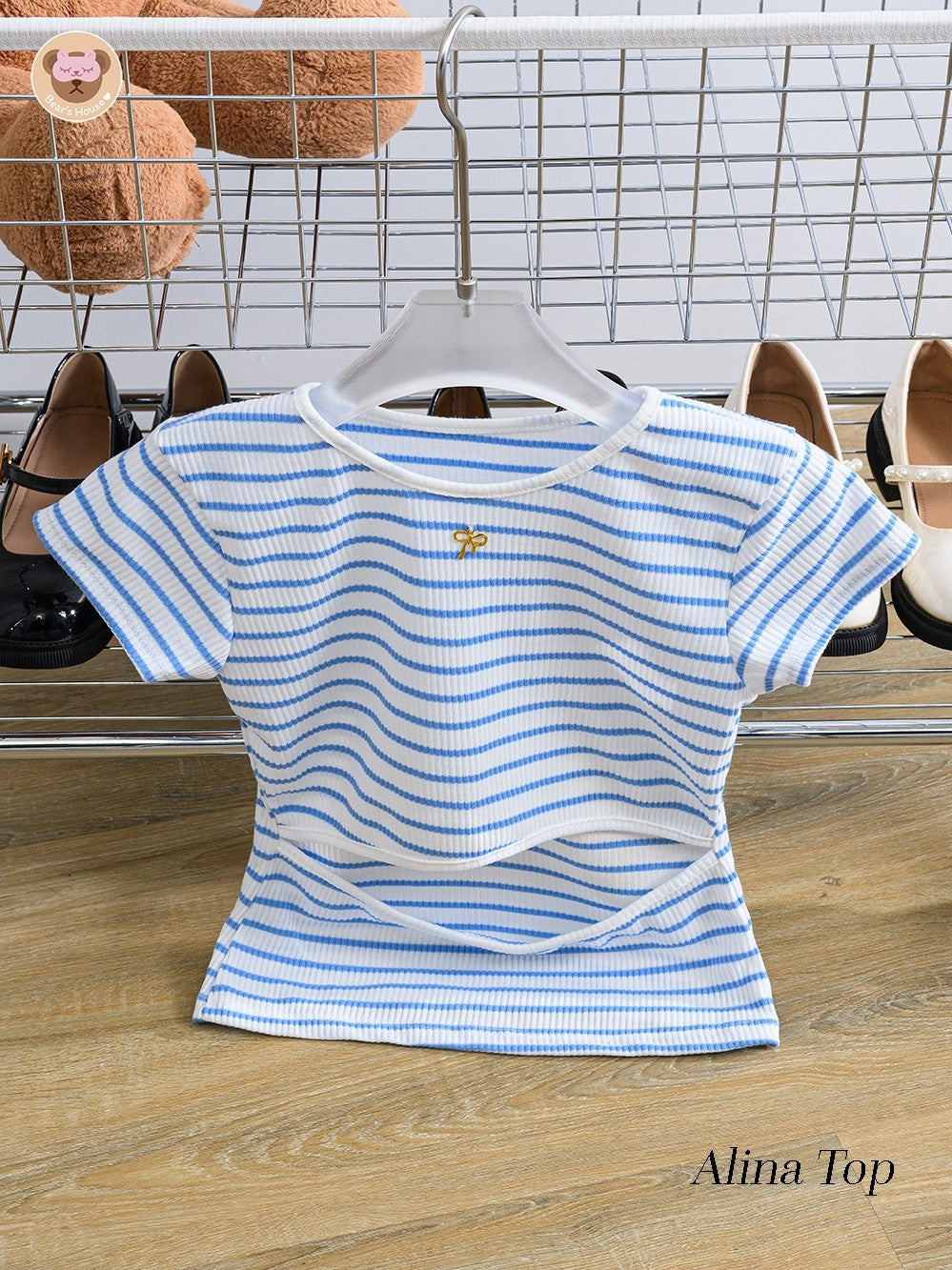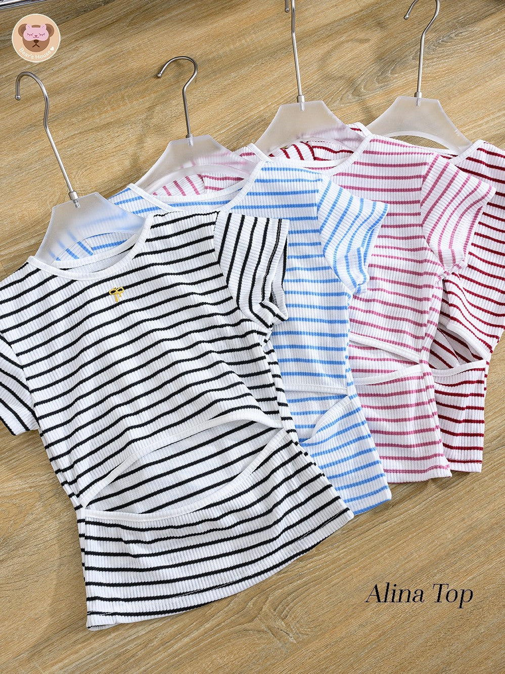 The Alina Top features a split waist with adorable gold bow embellishments on its striped fabric, adding a touch of cuteness to your wardrobe. It's the perfect fit, with just the right amount of sexiness to have in your closet.