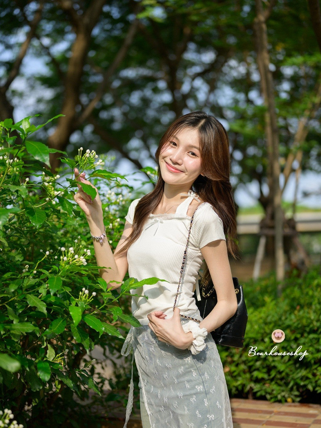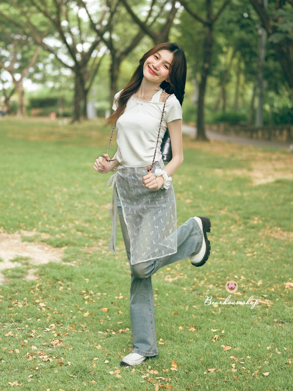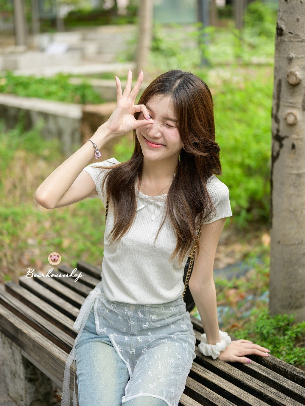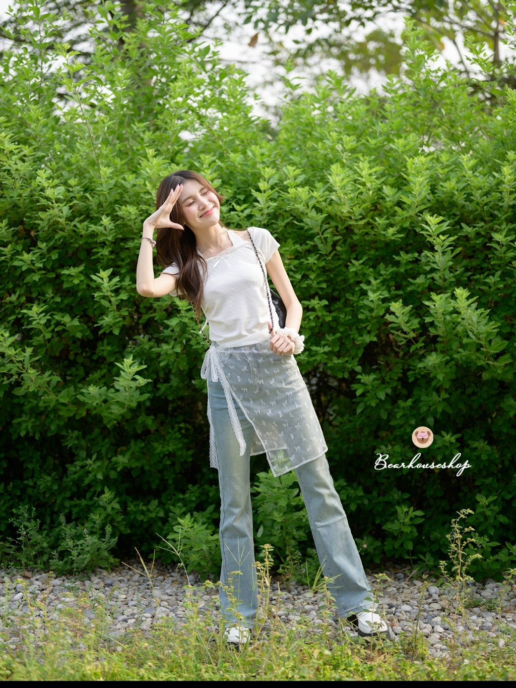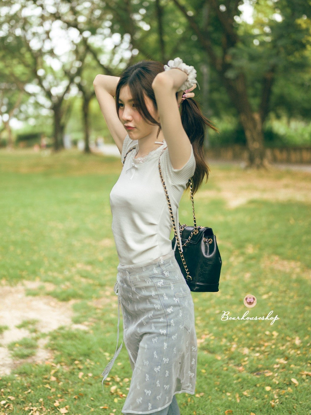 This crop top has short sleeves and delicate lace trim. A bow tie at the neck and ribbon details add a feminine touch, and it can also be worn off-shoulder. Made of stretchy ribbed fabric, it's comfortable and doesn't overheat. Plus, it doesn't require ironing - just wash, dry, and wear. It pairs perfectly with jeans or skirts. Mesh Waist Tie sold separately.