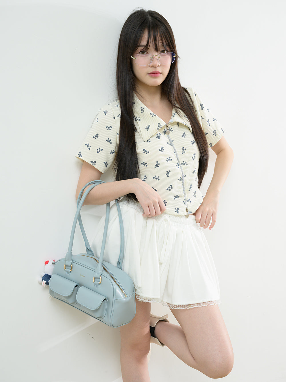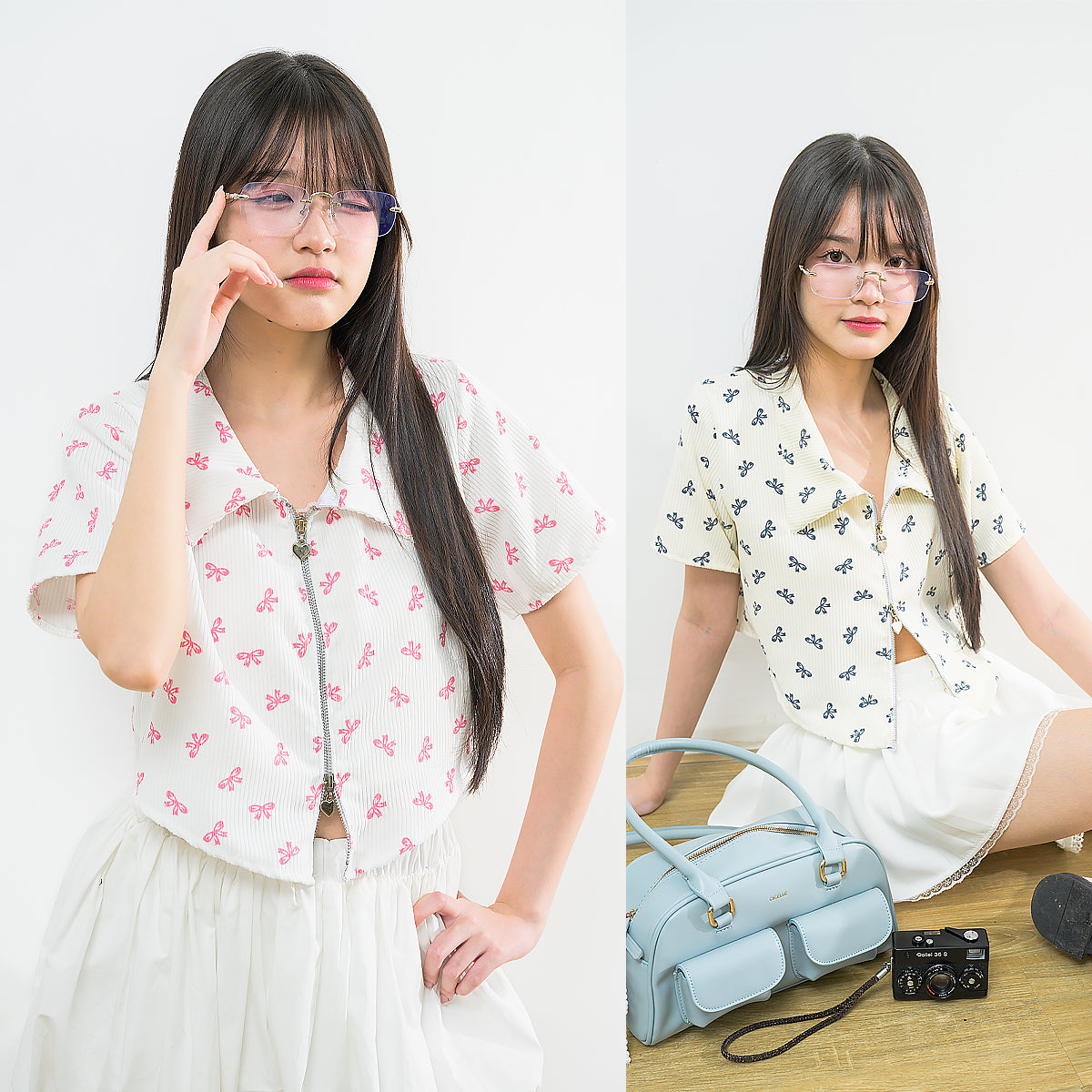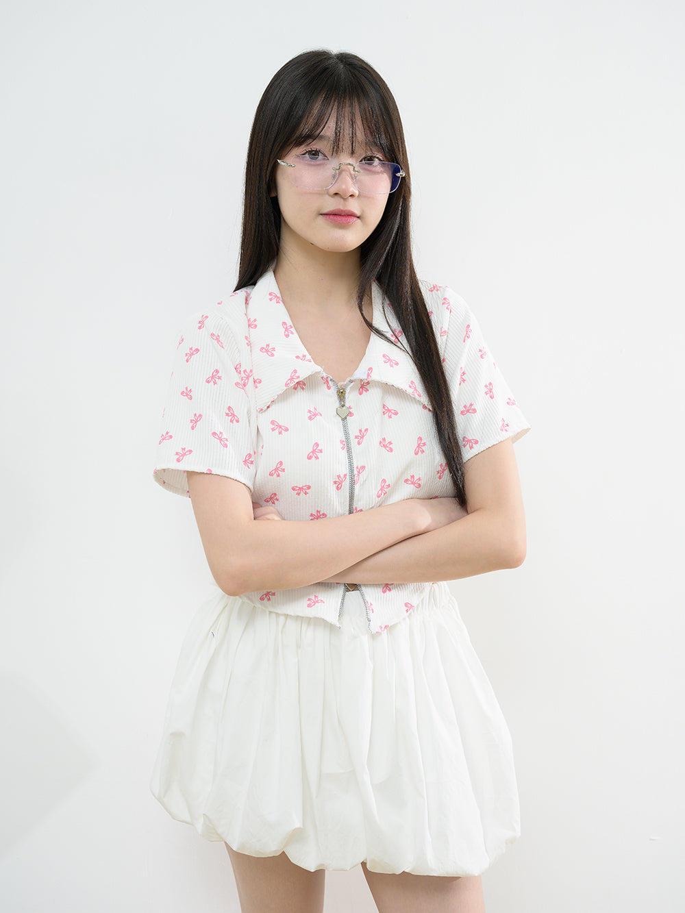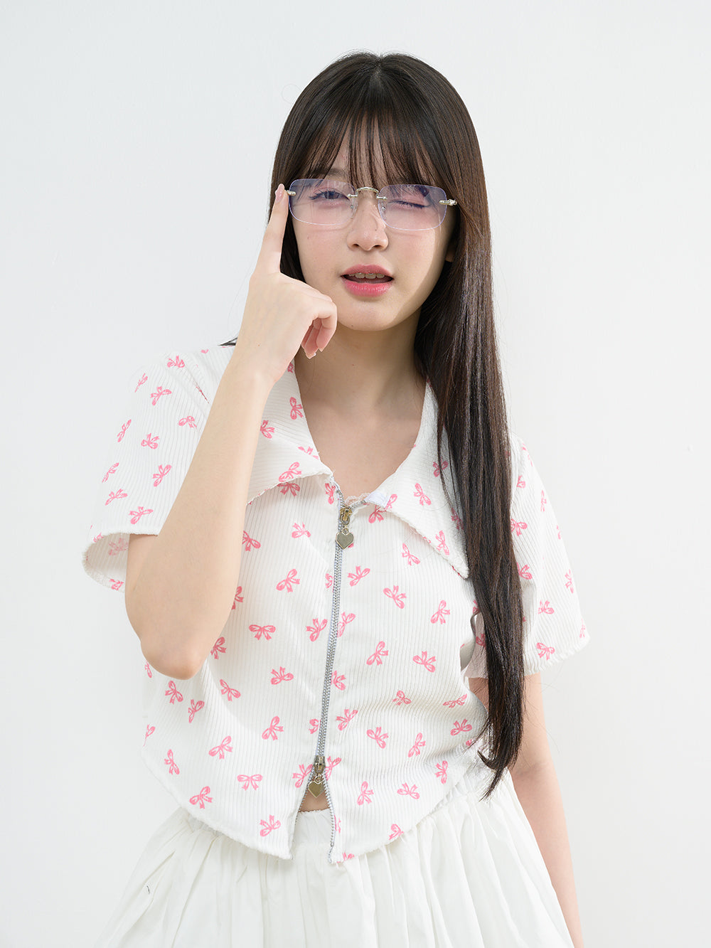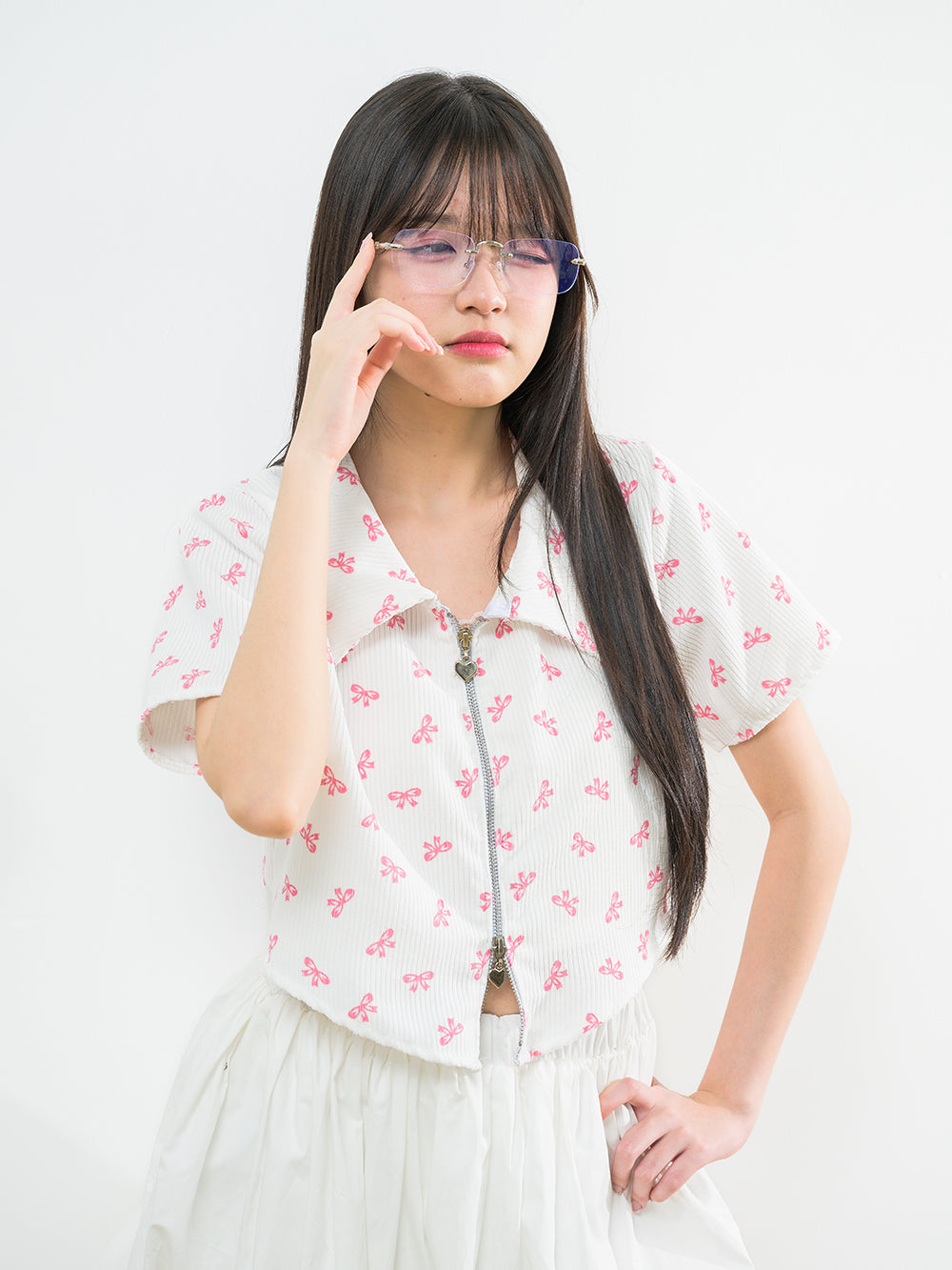 Accessorise with the Corrug Zipper Shirt, featuring a playful heart zipper on the zip collar. Made of corduroy fabric with a charming bow pattern, this shirt has unique curved tip detail and is just the right thickness. It's definitely a must-have for any closet!