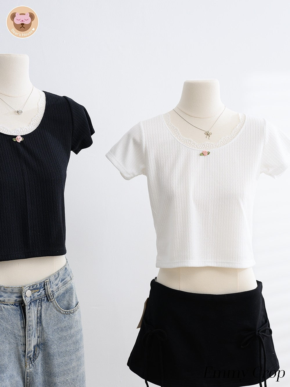 Emmy Crop t-shirt with square neckline, featuring playful pink roses and charming lace accents. The perfect blend of simplicity and cuteness, easily paired with skirts or pants.