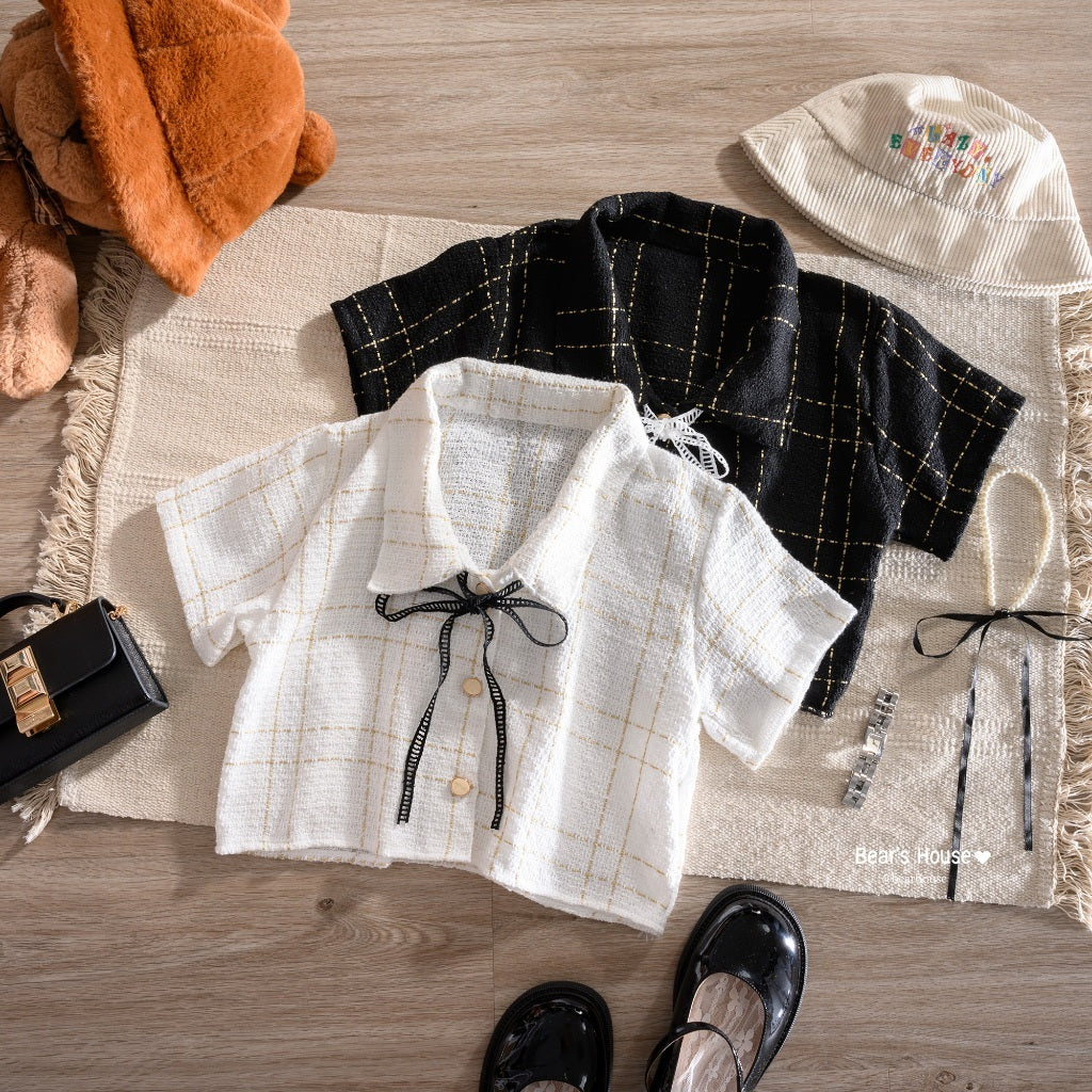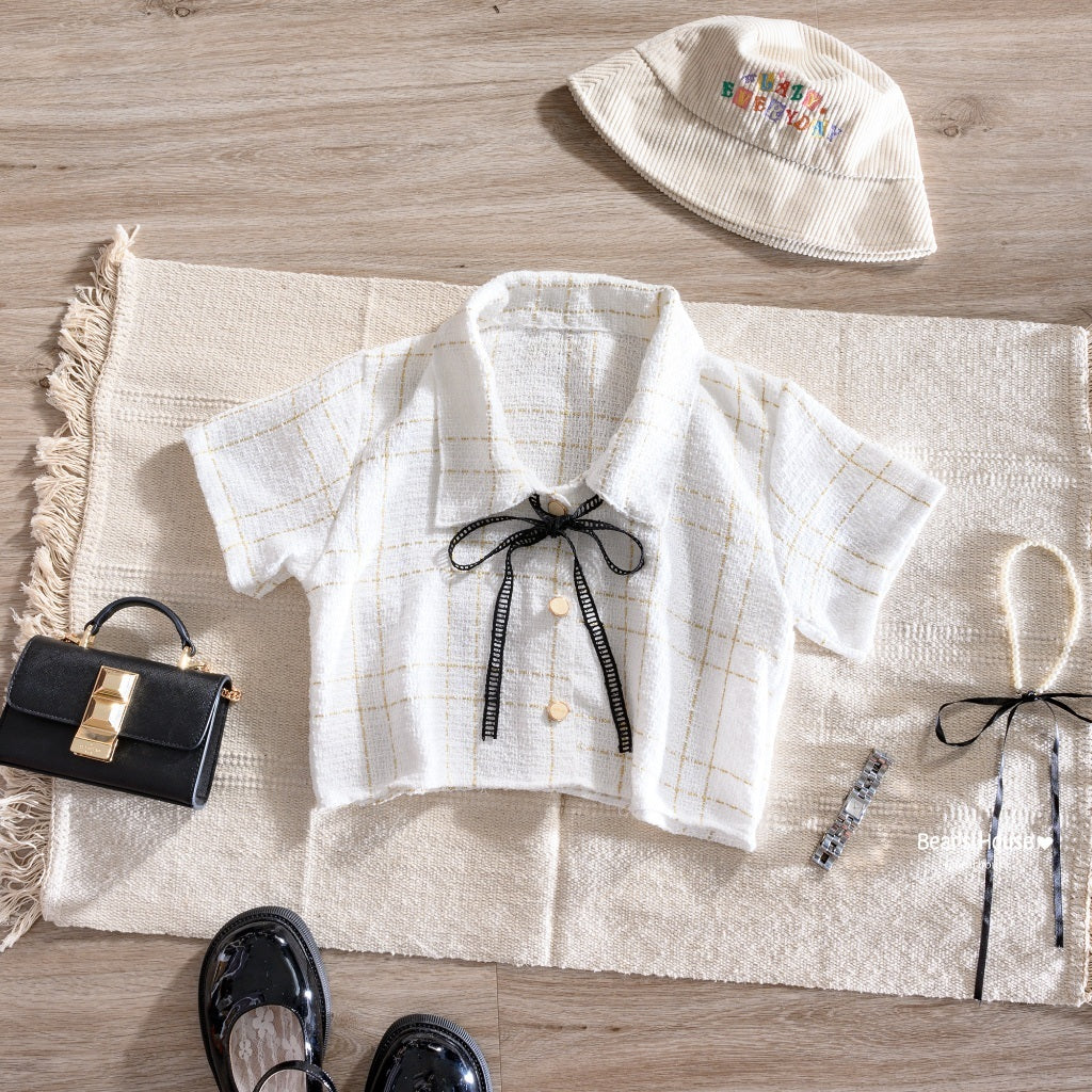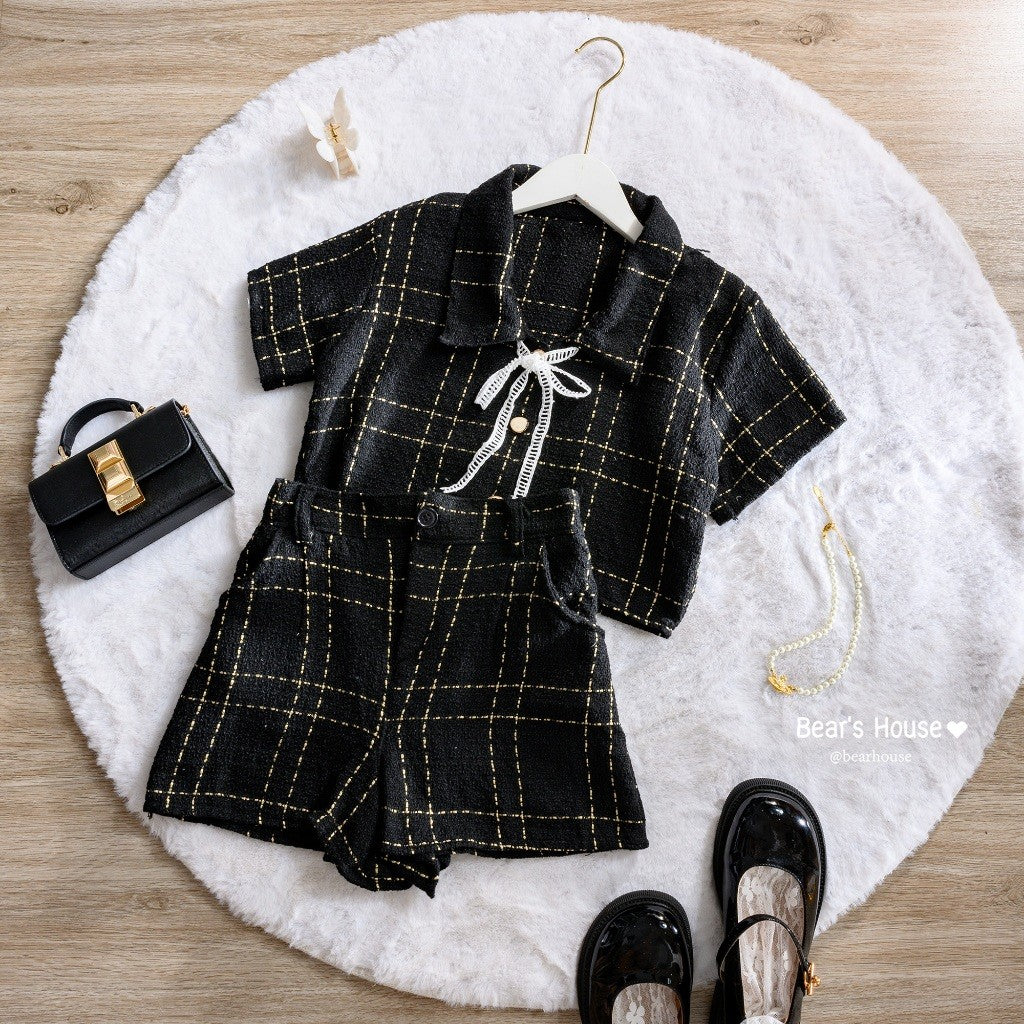 Get a fresh and flirty look with the Polly Tweet Top and Gigi Shorts set. This stylish shirt features short sleeves, a front tie bow, and soft tweed fabric that's cute and comfortable. Perfect for any occasion, from a day out with friends to a day at the office. No itch, just love! ❤️