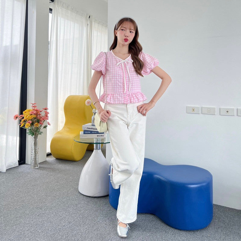 Add some playful charm to your wardrobe with the Sunday Scotte plaid doll-sleeve shirt. This quirky top features a working front button closure and a white bow cut, making it both functional and stylish. Plus, the chest is fully lined, making it comfortable and cute.